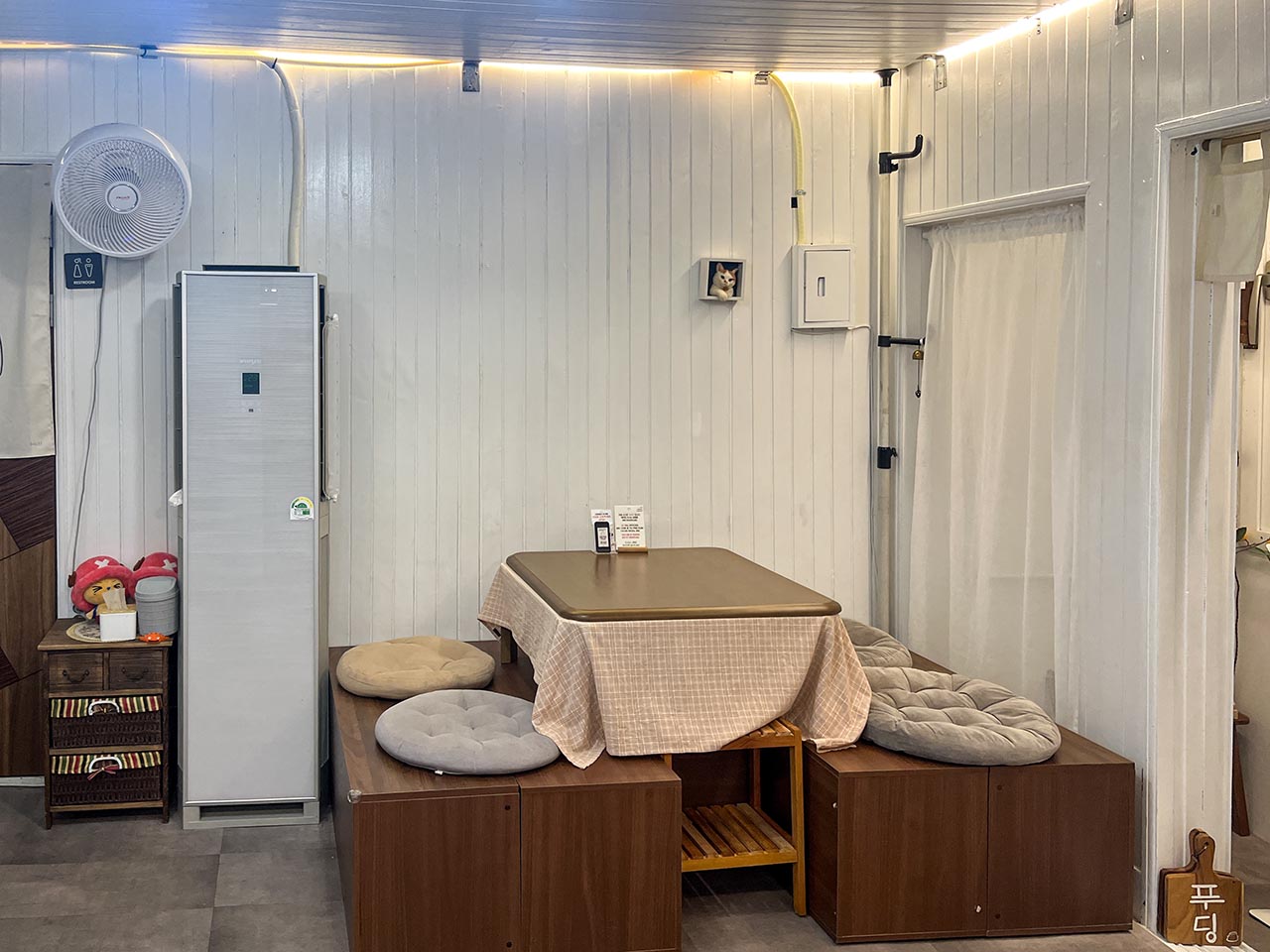 부산대 카페 모모후로 들어서면 정면에 커다란 키오스크가 보입니다. 오른쪽 문은 화장실이고 왼쪽에 방이 있습니다. 손님이 있어서 사진은 못 찍었습니다. 그리고 사진의 왼쪽 편으로 코타츠가 있는 방이 하나 있습니다. 오른쪽 편에도 테이블이 있고요. 가게는 좁지만 좌석이 밀도 있게 들어차있습니다.