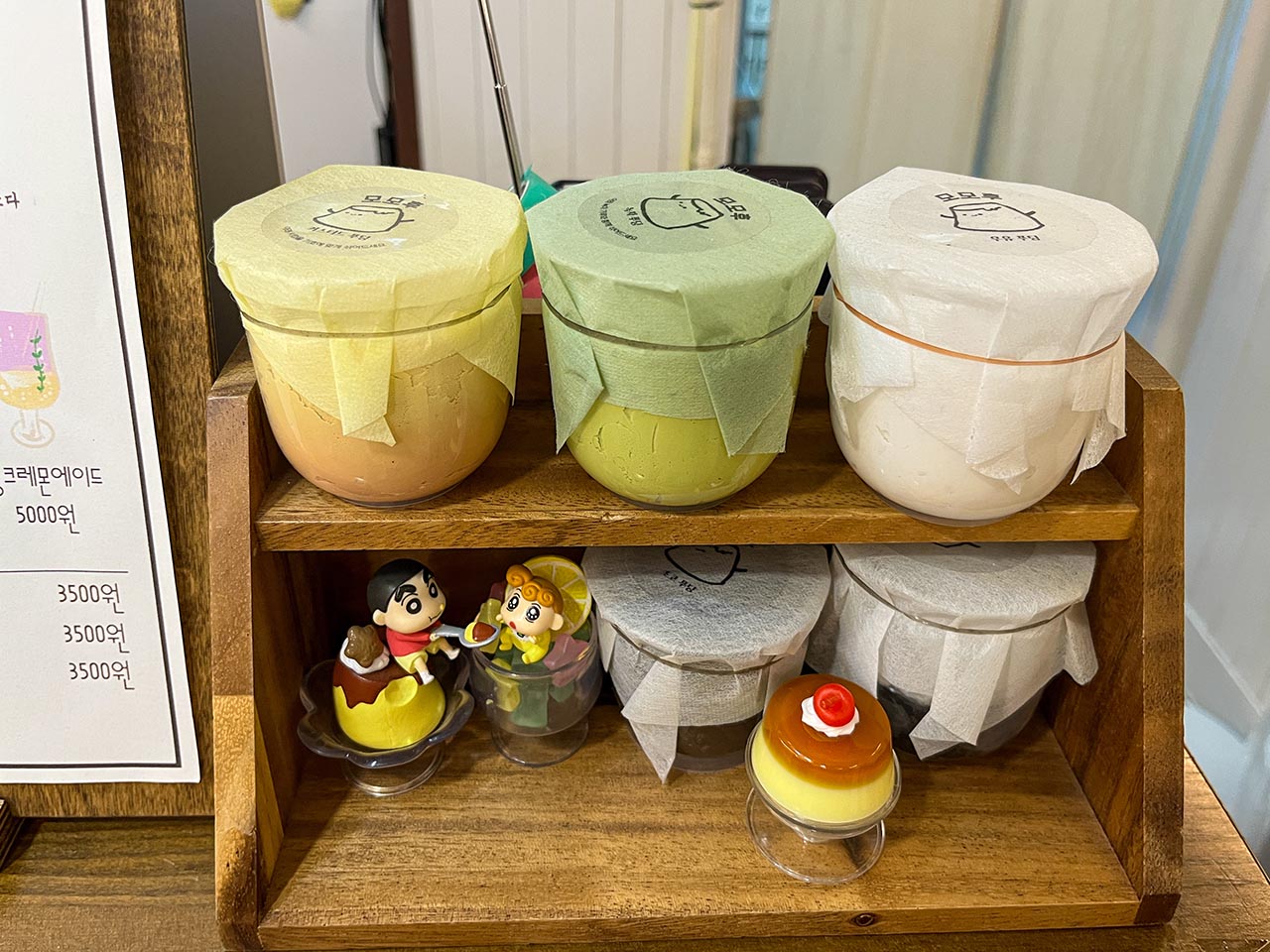 카운터에 전시되어 있는 푸딩입니다. 포장과 그림이 귀엽네요.