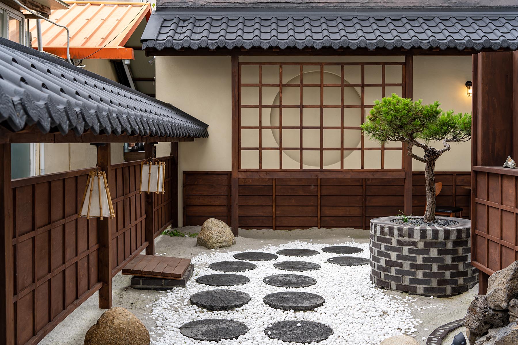 가게 입구로 향하는 길, 정원을 고산수식으로 꾸며두었습니다. 모레 위에 자갈을 깔고 디딤돌을 놓았네요.