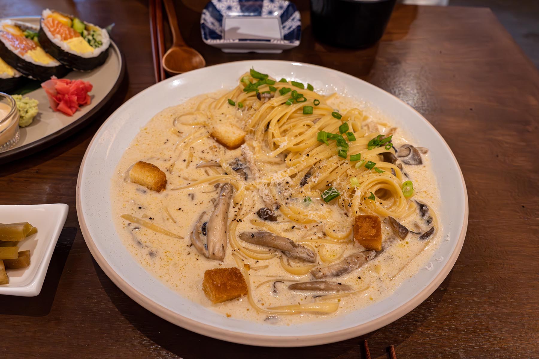 저희가 주문한 것은 연어 후토마끼와 트러플크림 파스타입니다. 장국이 각각 나왔고 파스타와 함께 피클이 나왔는데요, 일반적인 오이피클이 아니고 요즘 식당에서 많이 보이는 궁채로 만든 것 같았습니다. 그냥 집어먹어도 맛있습니다. 특이하게 장국에는 미역이 상당히 많이 들어있었습니다.