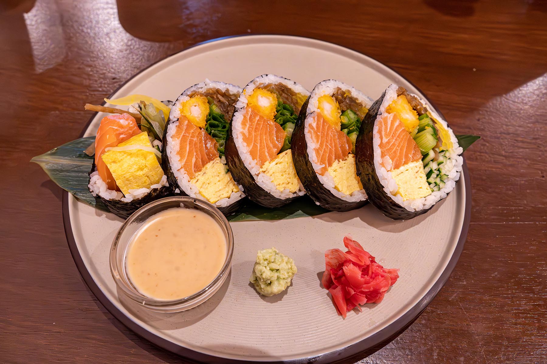 대표메뉴 연어 후토마끼(13,000원)입니다. 5p와 10p 중 5p로 주문했습니다. 가격으로 보나 양으로 보나 5p가 1인분인 듯합니다. 참깨 소스, 고추냉이, 생강 초절임이 함께 제공됩니다. 사실 생강은 안 먹어봤습니다만 생긴 걸로 보아 아마 맞겠죠.