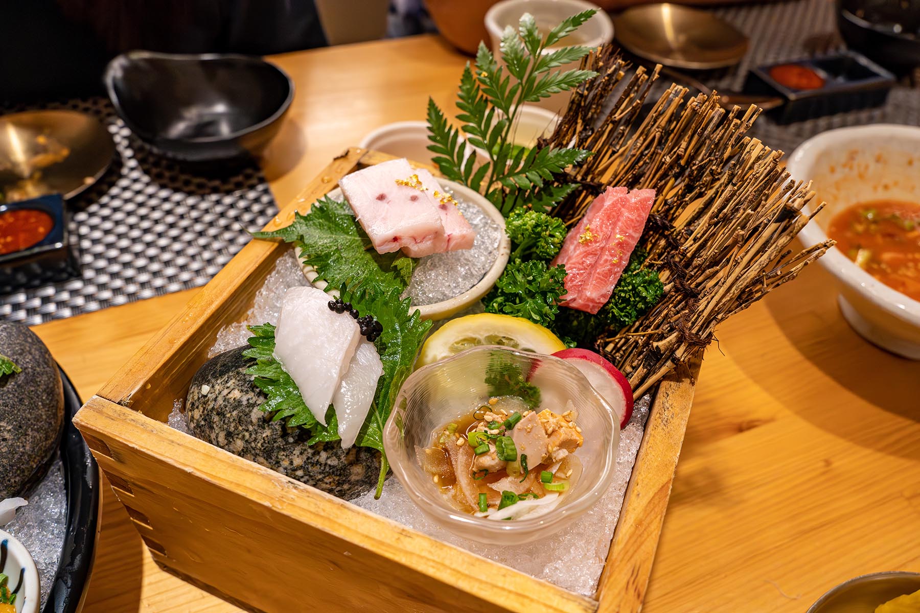 메인 사시미입니다. 구성은 눈다랑어 등살, 참돔, 광어, 연어, 농어, 밀치, 그리고 세로로 깔려있는 게 모둠입니다. 나머지는 단새우와 전복, 가리비, 고동(?), 그리고 소스는 전복 내장과 멍게 내장입니다. 하나하나 다 맛있었고요, 내장 소스는 원래 못 먹어서 아쉽지만 살짝 찍어 맛만 봤습니다. 아래에는 진짜 얼음이 깔려 있습니다.
