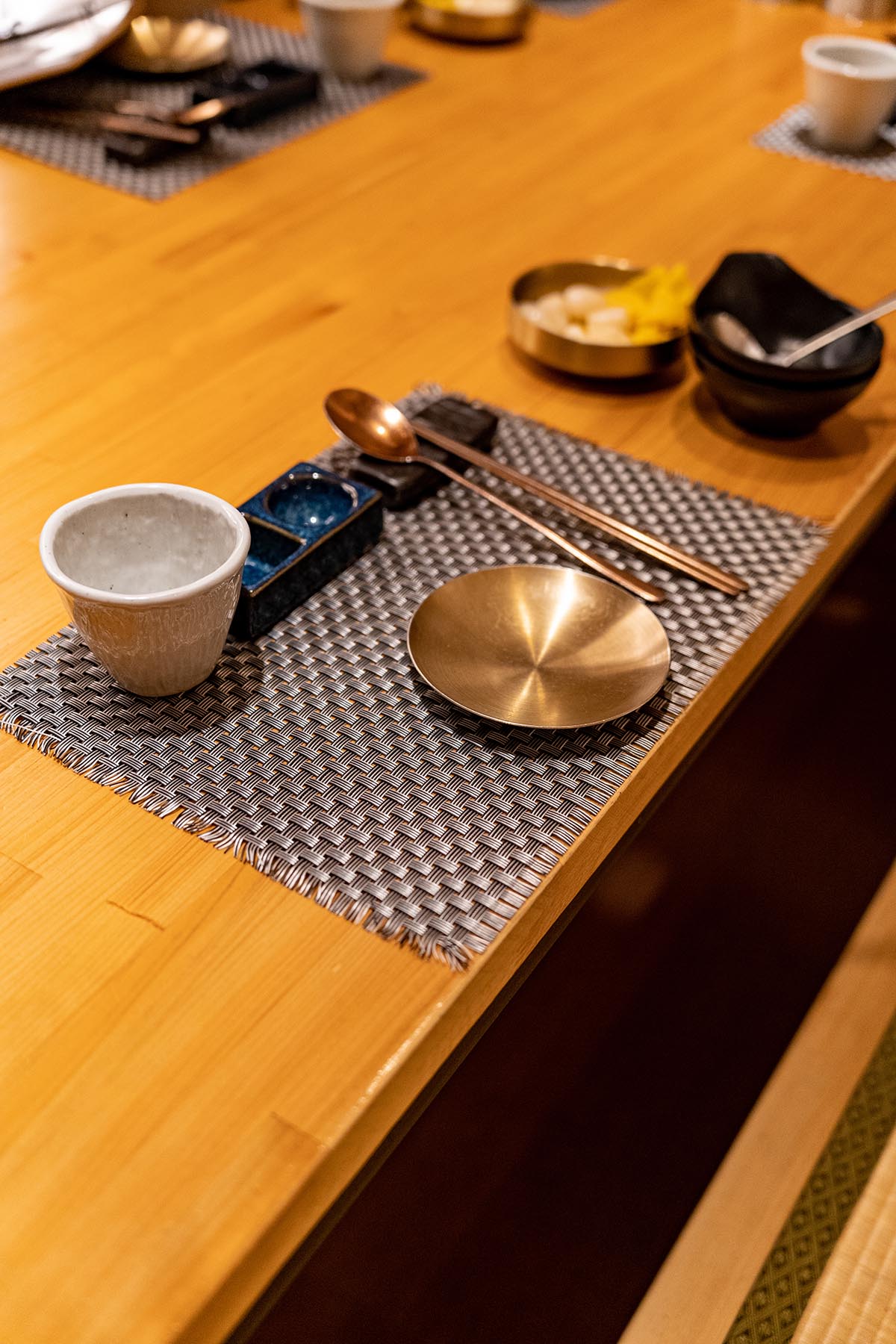 룸 내부에는 별다른 장식이 없이 깔끔하여 주의가 분산되지 않고 식사와 이야기에 집중할 수 있습니다. 허리가 불편해 맨바닥에 앉기 힘든 분들도 편하게 식사할 수 있도록 테이블 아래가 파여있습니다.