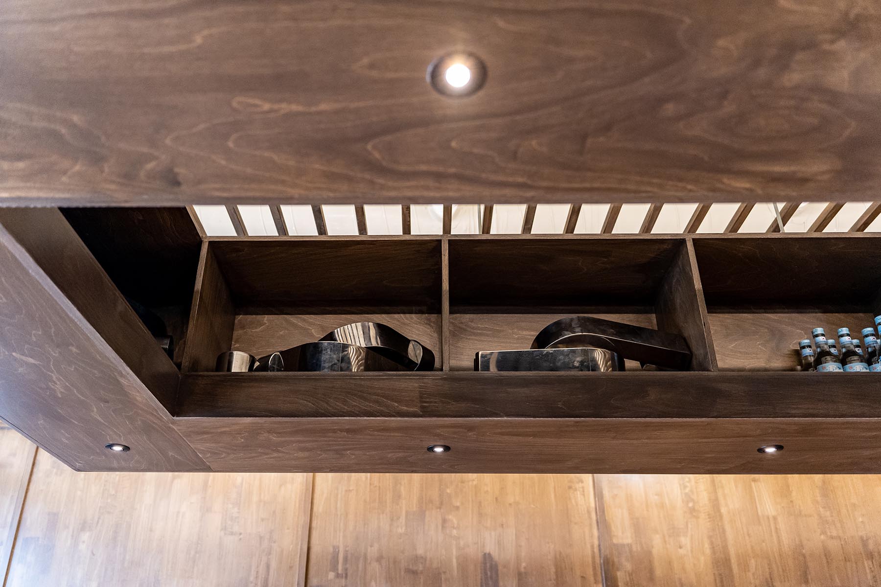 앞의 구멍은 야끼니꾸를 주문했을 때 나오는 화로의 환기통을 설치하는 자리인 것 같습니다. 저기를 열어서 찬장에 있는 기역자 형태의 환기통을 꽂는 방식인 것으로 보입니다.