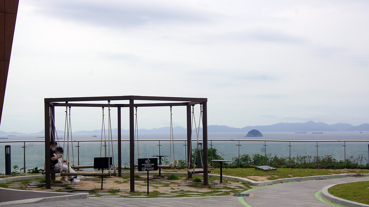 섬이라 바람이 많이 불어서 그런지 여기에도 바람개비가 있네요. 중앙을 기준으로 왼쪽과 오른쪽에 그네 모양의 벤치가 있습니다.