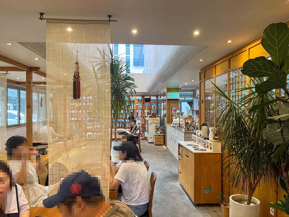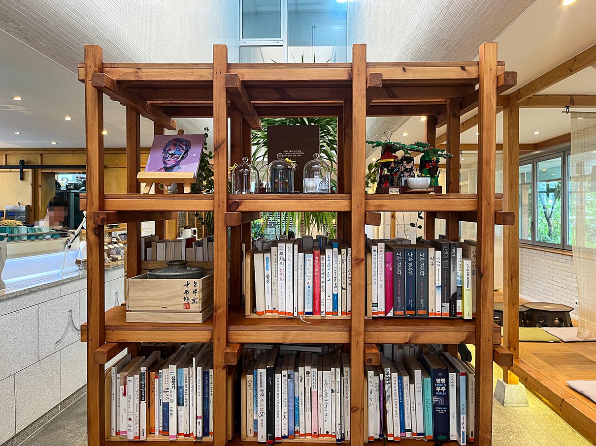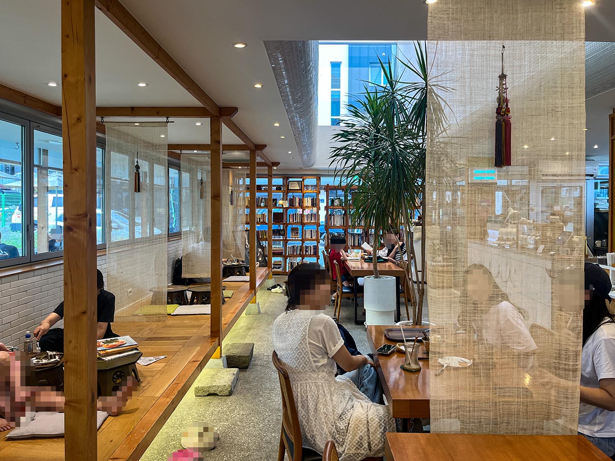하지만 당연히 좌식 좌석만 있는 것은 아닙니다. 입식 테이블도 여럿 마련되어 있기 때문에 문제없습니다. 책장 옆에 6인용 테이블이 있고요, 안쪽에는 4인용 테이블이 여러 개 있습니다.