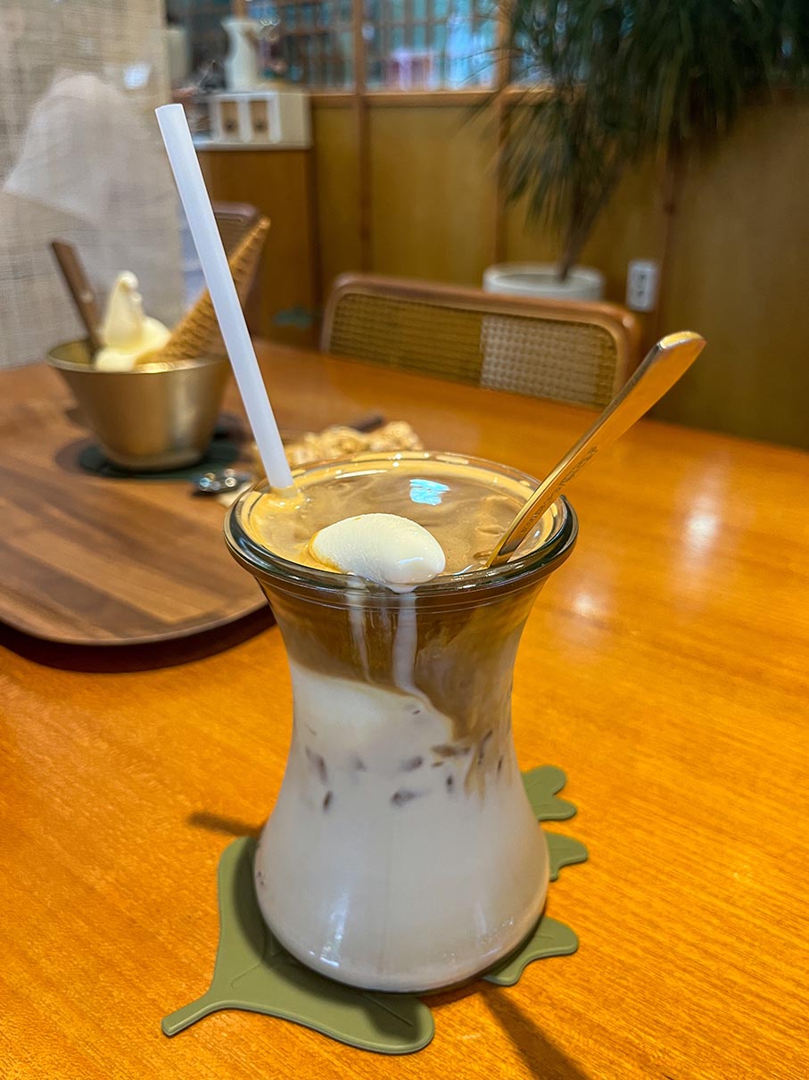 가배 달곰라테(6,700원)입니다. 수제 젤라토와 함께 즐기는 달콤한 아이스 라테라고 소개하고 있습니다. 젤라토가 맛있습니다. 커피도 좋았고요. 엑설런트 라테와 비슷한 맛인데요, 시럽을 넣은 것과는 다른 느낌의 달콤한 카페라테라고 생각하시면 됩니다. 소소서원의 젤라토는 단맛이 강하지 않고 약한 짠맛이 나기 때문에 달곰라테도 너무 달지 않고 맛있었습니다. 나뭇잎 모양의 코스터가 귀여웠습니다.