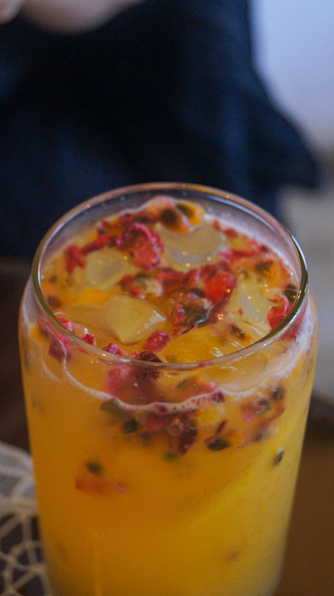 장미유자에이드는 함께 나오는 소스(?)를 넣어서 잘 저어 먹으면 됩니다. 패션프룻과 장미를 혼합한 것처럼 보입니다.