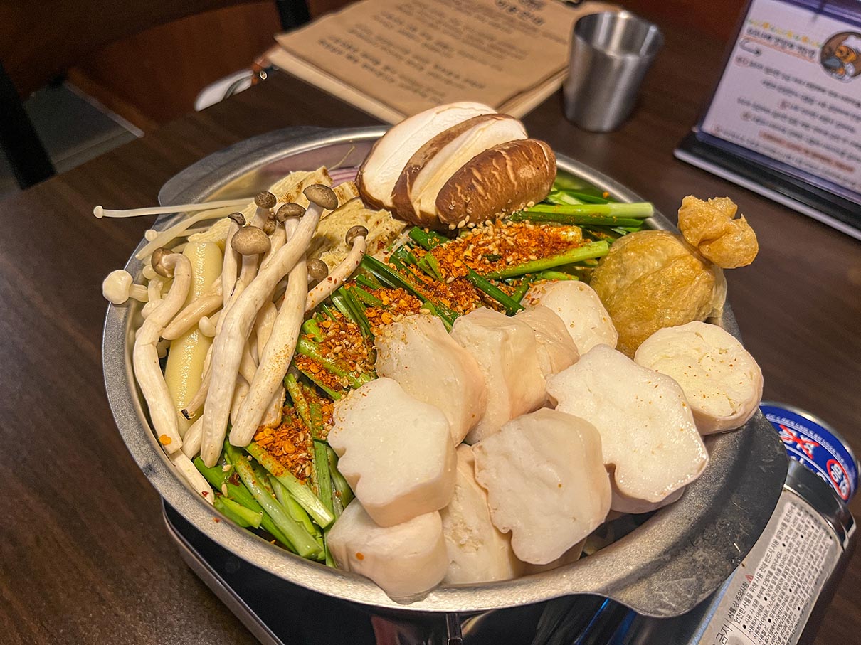 냄비 가득 재료가 올라간 모츠나베가 나왔습니다. 버섯과 부추, 유부주머니, 우엉, 숙주 등 다양한 재료가 들어있습니다. 대창이 어묵처럼 생겼죠? 자주 보던 대창이랑 모양이 다르게 생겨서 당황스러웠는데요, 끓이고 나니 익히 보던 프릴 같은 모양으로 바뀌었습니다.