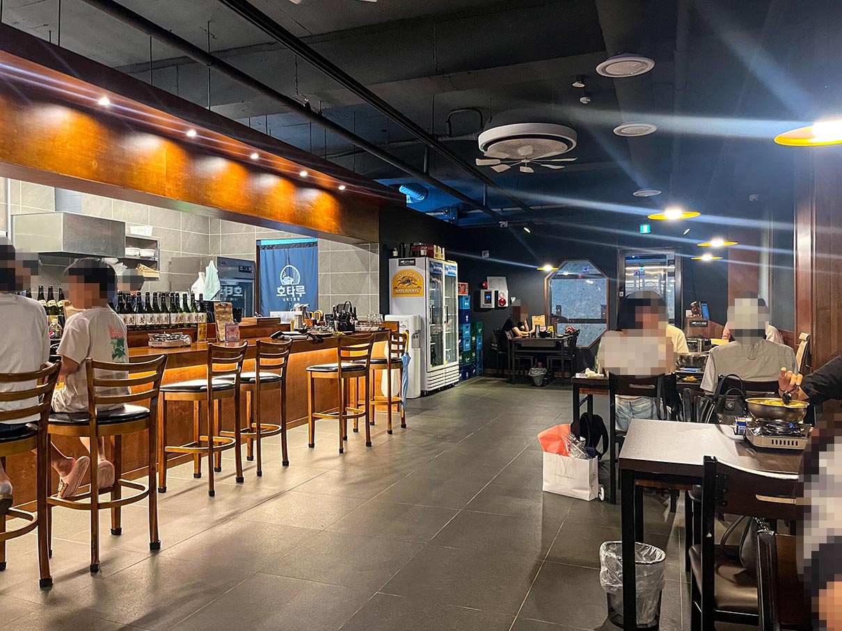 내부입니다. 2/3 지점에서 입구 방향을 바라보고 찍었는데요, 손님들이 많아서 사진 찍기가 조금 곤란해서 내부 사진은 이것밖에 없습니다. 가게가 길게 뻗어있고 중앙을 비워두었고요, 카운터석이 대략 10~12석, 그리고 벽 쪽으로 테이블이 늘어서있습니다. 주방과 테이블의 거리가 멀어 서빙하기에 불편해 보였습니다. 벨이 없어서 멀리서 큰 소리로 부르거나 손짓을 해야 하는데 술집이다 보니 좀 시끄럽고 정신없어서 추가 주문이나 기타 요청사항이 발생하면 조금 곤란했습니다. 저는 둘 다 싫어서 직접 주방 가까이 가서 이야기하고 왔습니다.