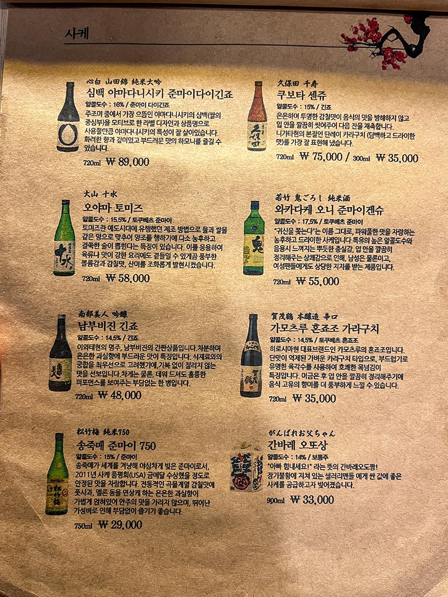 주류도 다양하게 준비되어 있습니다. 요즘 유행인 하이볼도 여러 가지 있네요. 아쉽지만 운전을 해야 해서 술은 마실 수 없습니다. 사케류는 뒷장에 사진과 설명이 함께 나와있습니다.