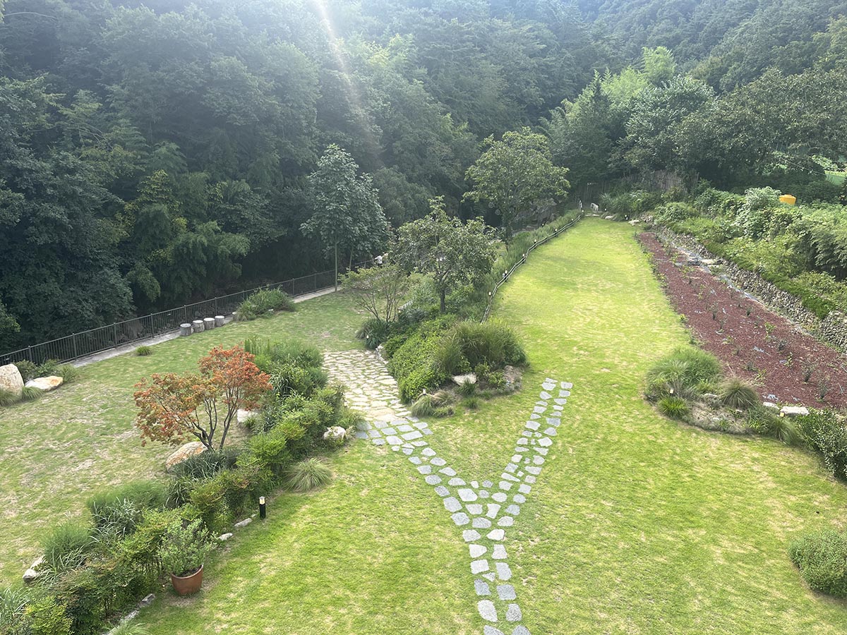 뒷마당입니다. 뒷마당은 높은 곳과 낮은 곳이 있습니다. 낮은 곳이 폭포와 가까운 쪽입니다. 높은 곳은 텃밭이 있고요, 한쪽에는 로즈메리가 심어져 있어서 향기가 좋습니다. 폭포는 생각보다 작아서 '이게 폭포야?' 싶을 수 있는데요, 일단은 폭포죠. 그래도 카페에서 이런 계곡 같은 모습을 볼 수 있는 곳이 흔하지는 않으니 은유재의 매력 포인트라고 할만합니다.