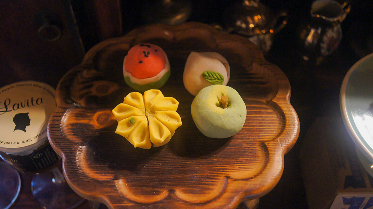 화과자지요. 맛은 검은깨, 자색고구마로 2가지입니다. 복숭아와 해바라기가 같은 맛, 수박과 사과가 같은 맛입니다.