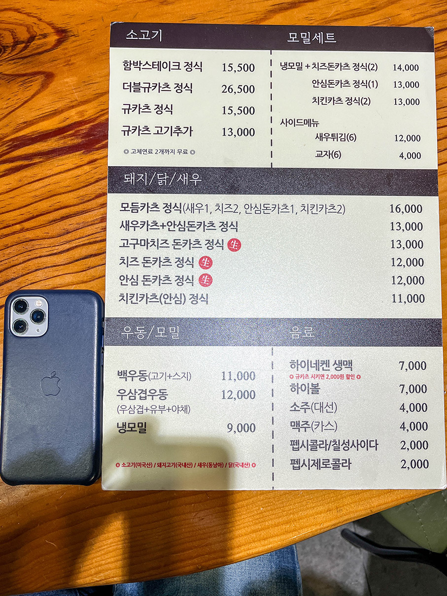 메뉴판입니다. 오랜만에 왔더니 메뉴판이 바뀌었는데요, 크고 두꺼운 폼보드 재질입니다. 비교용으로 옆에 아이폰 11 프로를 놓고 찍어봤는데 크기가 가늠이 되시나요? 내구성은 좋아 보이는데 기름기가 묻어있어서 조금 미끄럽고 무거워서 불편하더라고요. 대신 글자가 큼직큼직해서 가독성은 좋습니다.