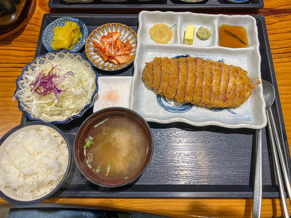 규카츠 정식(15,500원)입니다. 생각해 보니 몇 그람인지 안 나와있네요? 이 부분은 메뉴판에 기재를 해줘야 하지 않을까 싶습니다. 여하튼 장국과 샐러드, 김치와 단무지, 그리고 소스들이 제공됩니다. 샐러드는 유자 소스 덕분에 상큼하고 맛이 좋습니다.