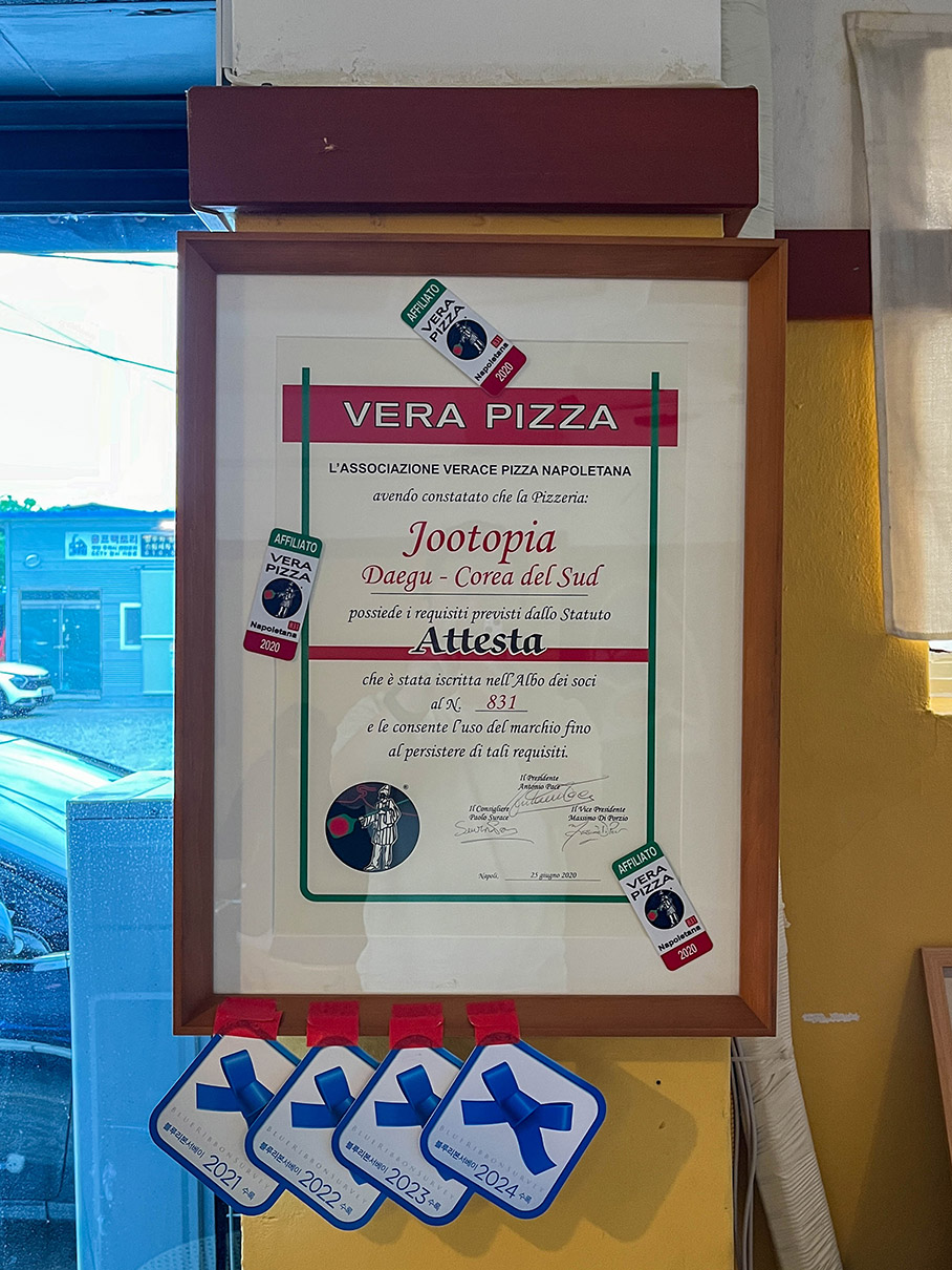 주토피아는 국내에 총 8곳, 대구에 2곳 있는 AVPN 인증 피자집 중 하나입니다. (AVPN에 관한 정보는 조금 아래에) 다른 한 곳은 앞산 쪽에 있는 지오네 피자인데요, 지오네 피자보다 근처에 있는 로벤 하우스가 평이 더 좋더라고요. 물론 맛이란 건 주관적인 것이니 어느 쪽이 더 낫다고는 할 수 없습니다. 저도 조만간 두 군데 다 가보고 판단을 내려보려고요. 여하튼 주토피아는 예약 없이는 이용하기 어려움이 있는 곳인데요, 문자메시지로 예약을 할 수 있습니다. 자세한 정보는 링크를 참고해 주세요.(예약 방법 링크-네이버)