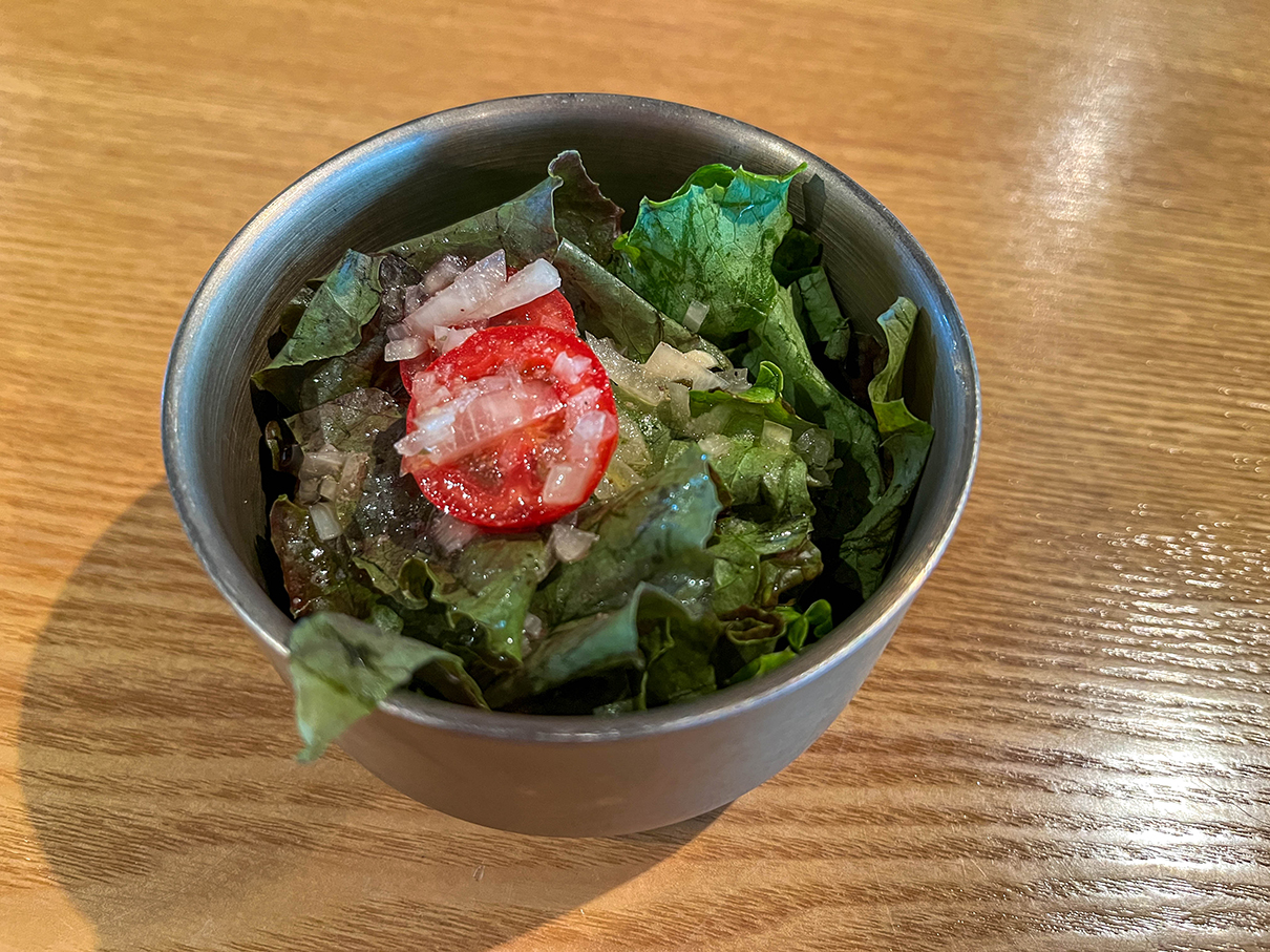 식전 샐러드와 히츠마부시 주문 시 제공되는 튀김입니다.