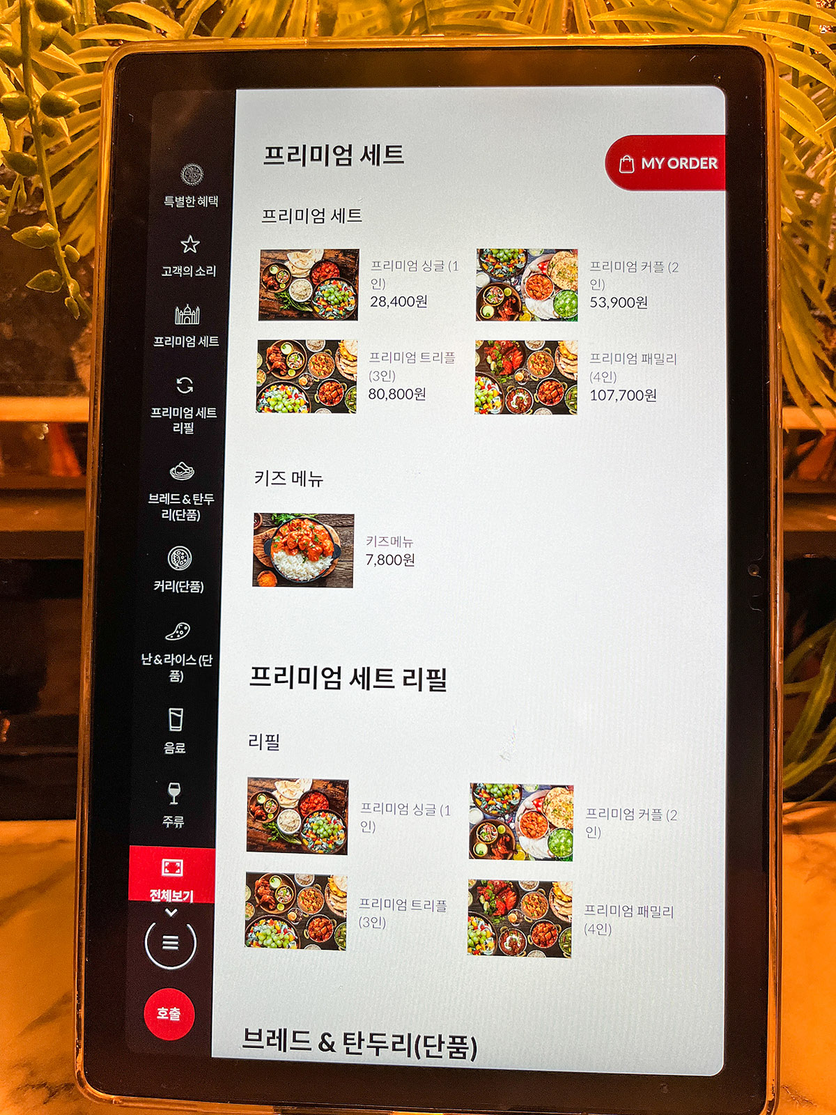 자리마다 비치되어 있는 이 태블릿으로 주문, 리필 요청을 하게 됩니다.