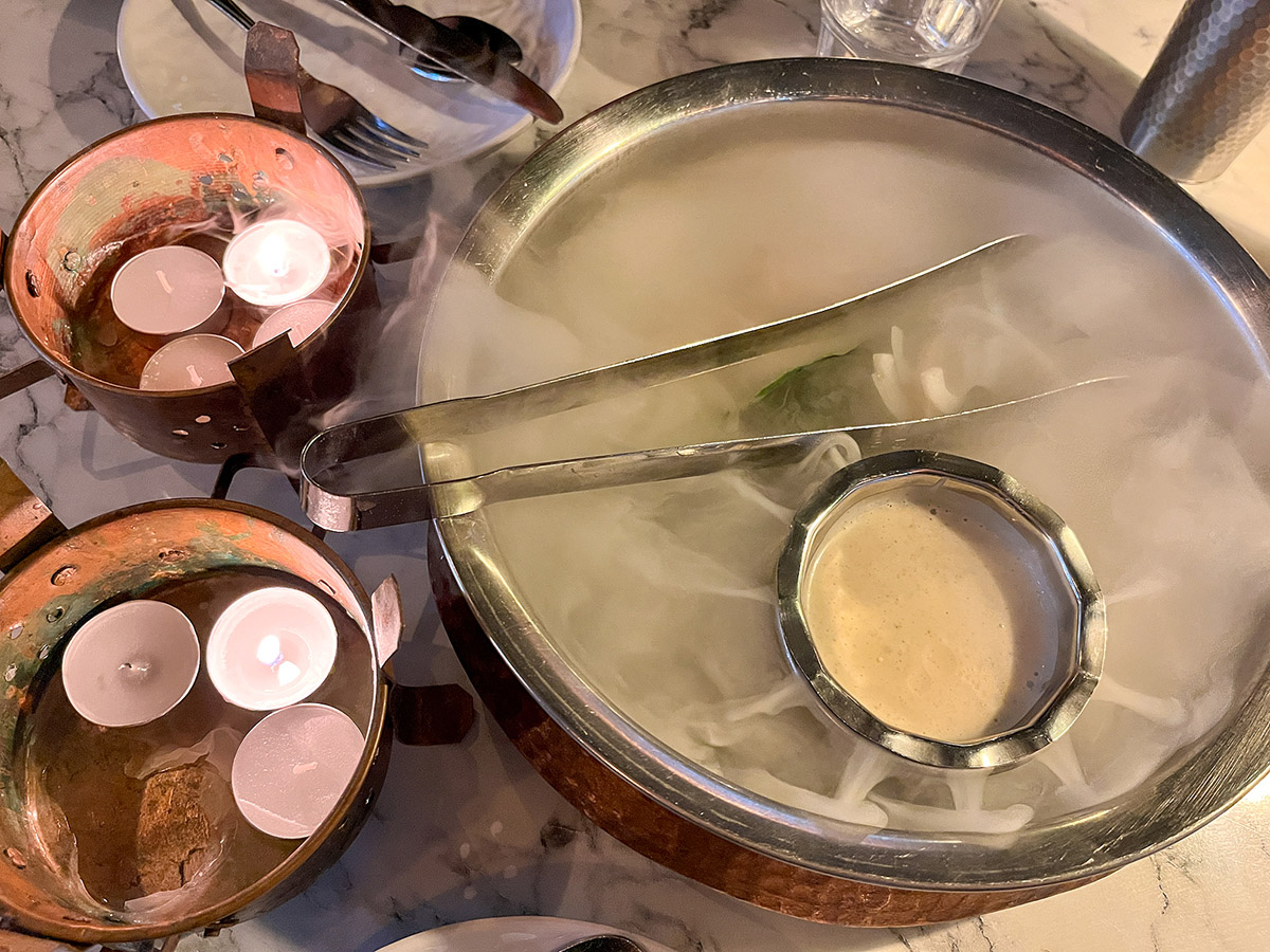 김이 모락모락 나는 저건 샐러드고요, 하얀 소스는 트러플 소스입니다. 저 소스가 정말 기가 막혔습니다. 저 소스가 자꾸 생각이 나요. 왼쪽의 초는 그 위에 카레를 얹습니다. 따뜻하게 유지되도록 초를 켜주는 모양입니다.