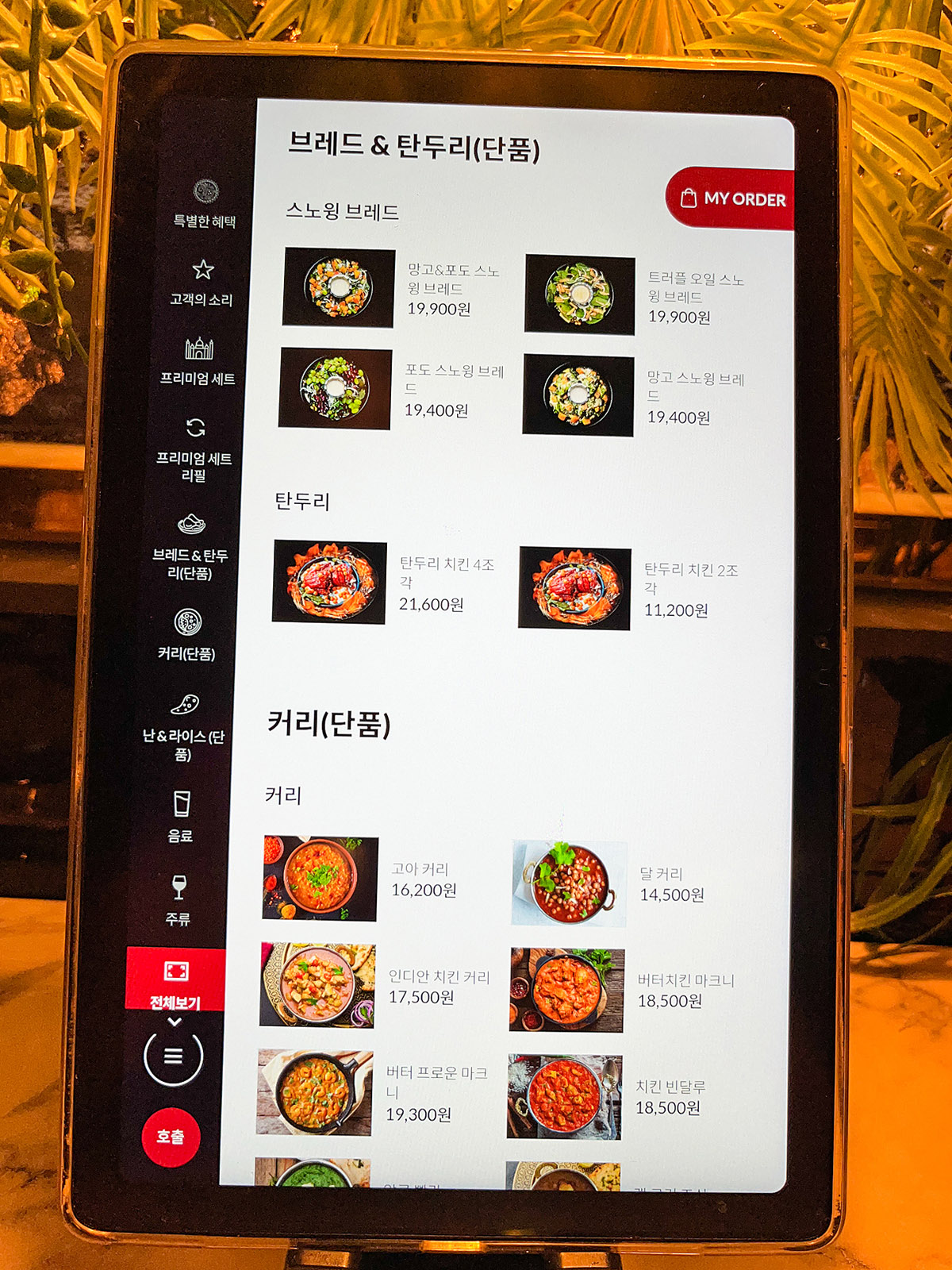 아그라에서는 태블릿으로 주문을 해야 한다고 말씀드렸죠. 태블릿에 표시되는 메뉴들을 찍어왔습니다. 가시기 전에 미리 참고하세요.