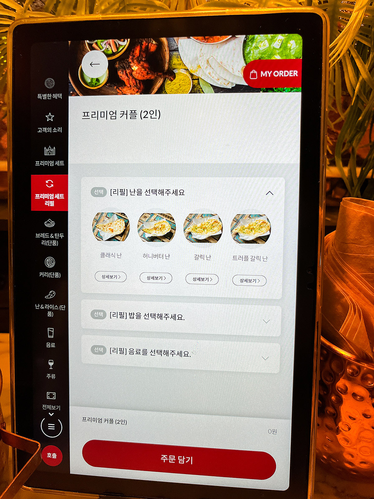 저희는 프리미엄 커플(2인)을 주문했습니다. 아래의 프리미엄 세트 리필 항목은 프리미엄 세트 주문 시 리필이 가능한 메뉴들을 리필 요청할 때 쓰는 부분입니다. 리필 메뉴에는 어떤 것들이 있는지도 아래에 사진이 있습니다.