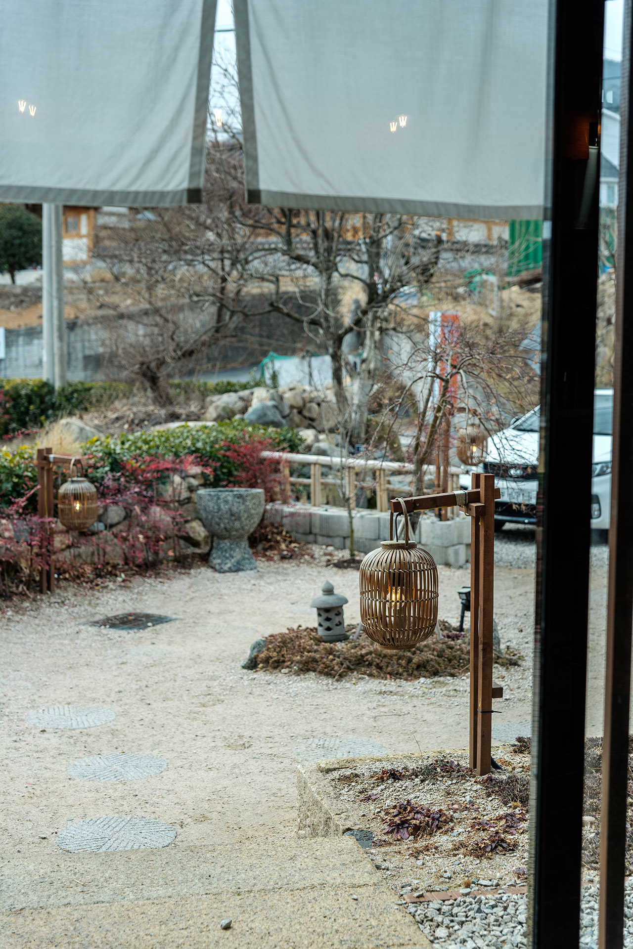 가게 안에서 출입문을 통해 밖을 바라본 모습입니다. 노렌과 등, 정원이 분위기 있게 잘 어울리네요.