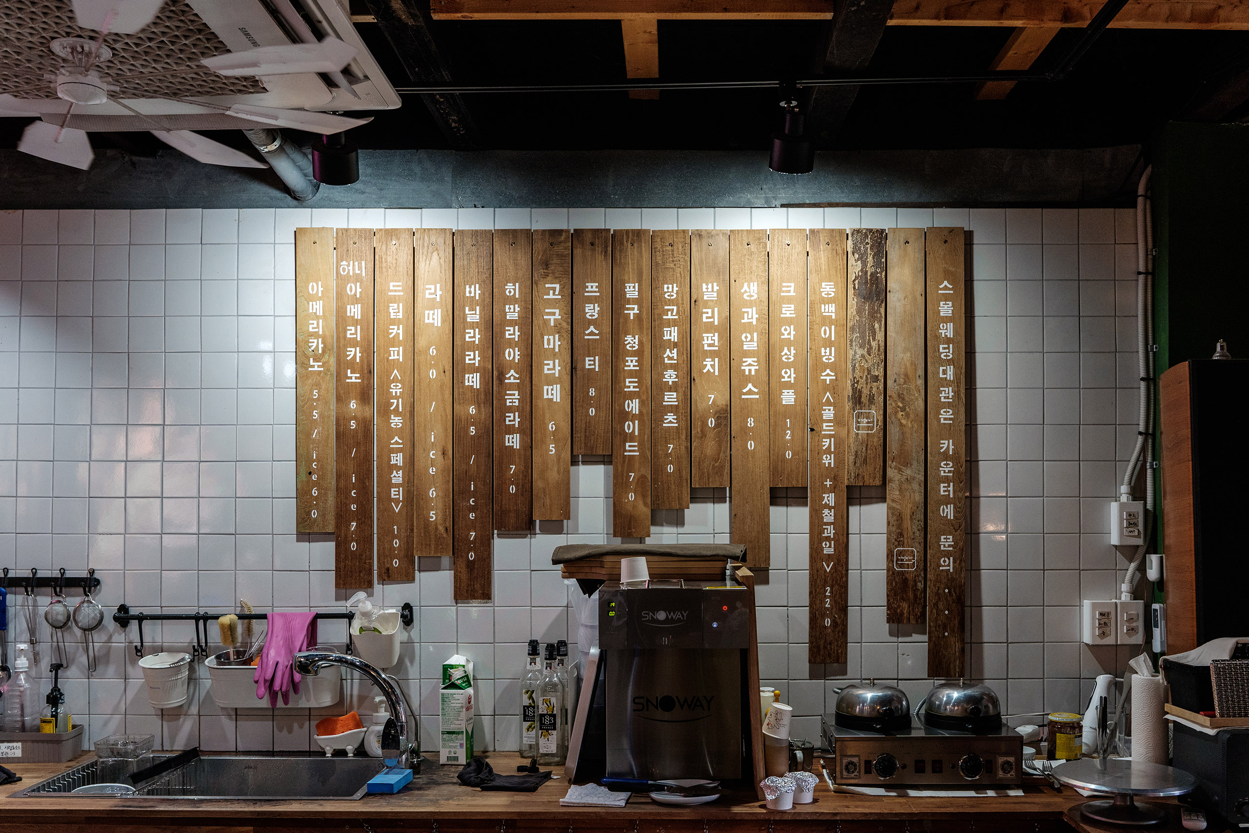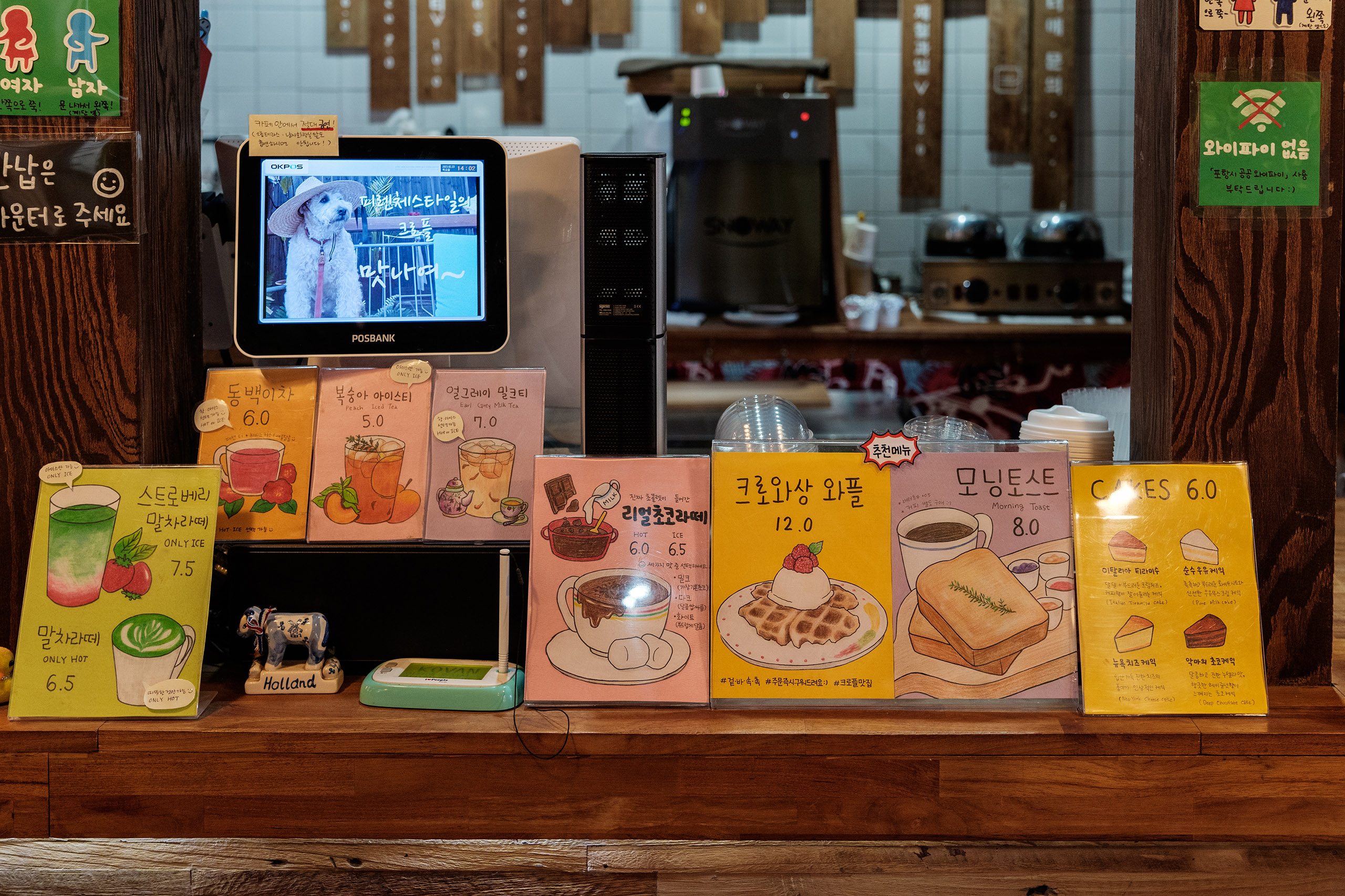 베이킹 공간은 따로 안 보이는 걸로 봐서 케이크류는 사다 쓰는 것이 아닐까 싶습니다. 여자 화장실은 안쪽에, 남자 화장실은 바깥쪽에 있습니다. 주문하면 진동벨을 주고, 먹고 나서 반납은 카운터로 해주시면 됩니다. 2층 올라가는 계단이 좁고 가파르니 조심하시고요.