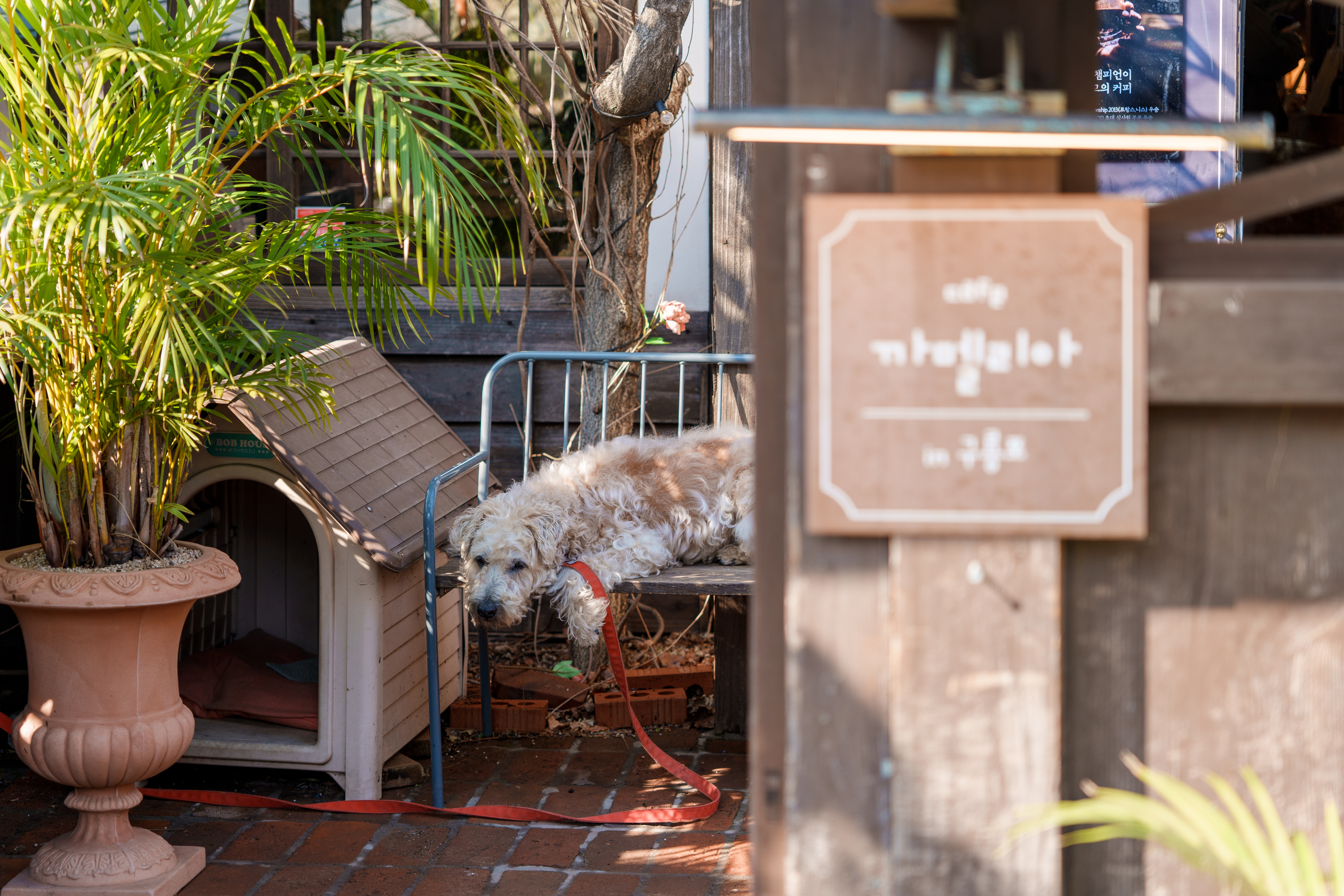 2층은 바깥에도 자리가 있는데요, 1층에서는 내부와 외부에 계단이 있어서 어느 쪽으로 올라오든 상관없습니다. 외부가 정말 예뻐서 조금만 더 따뜻해지면 바깥에 자리 경쟁이 치열할 것 같습니다. 아직 바깥에 앉아있기엔 약간 추운 날씨인데도 이미 이용 중인 사람들이 2팀 있었습니다. 아주 커다란 개도 한 마리 있는데 순해서 사람을 좋아하더라고요.