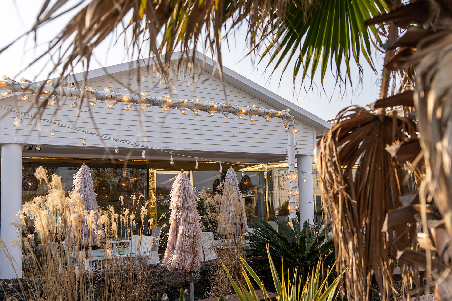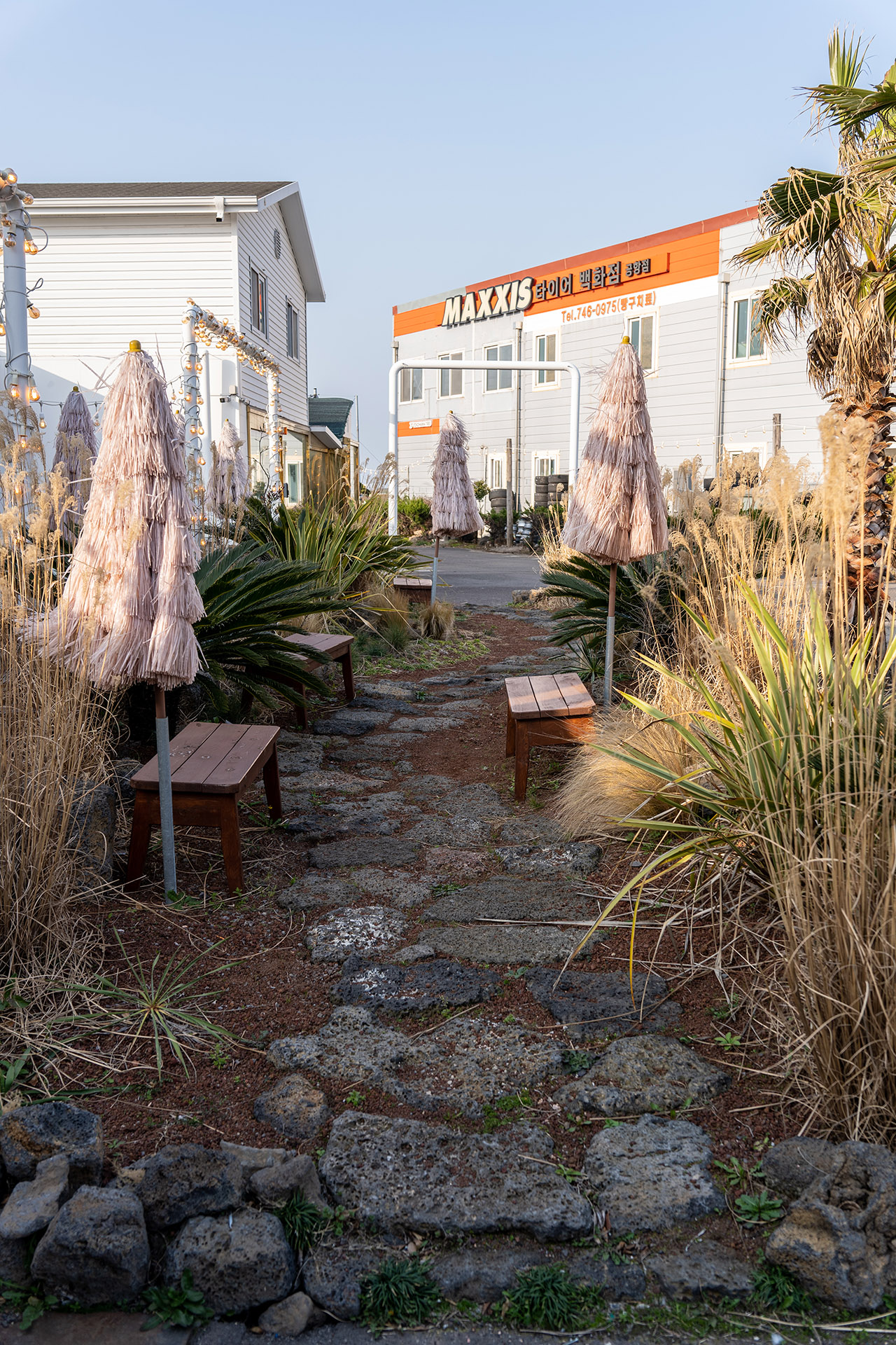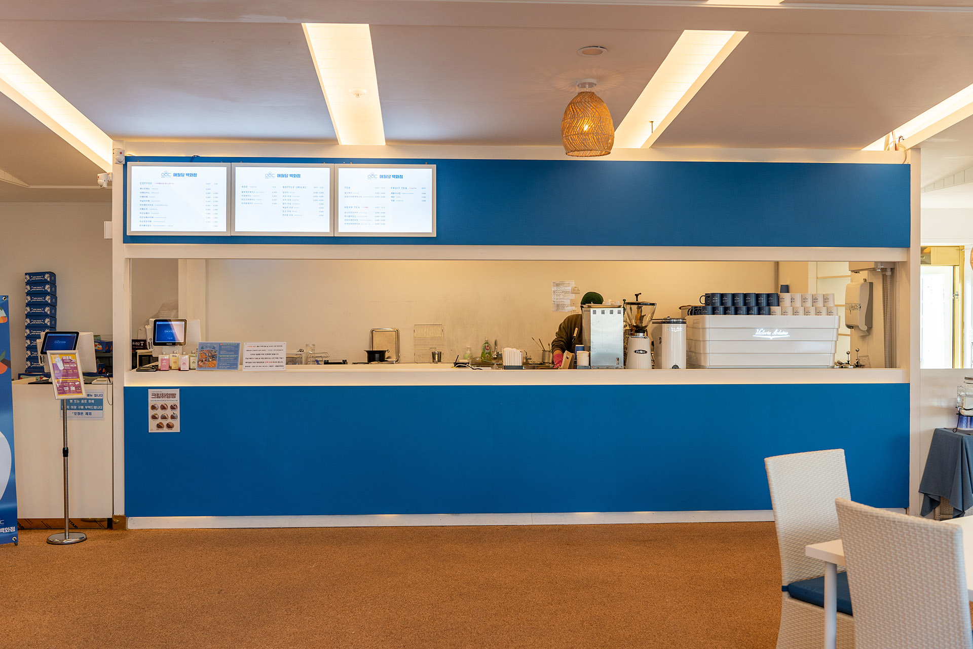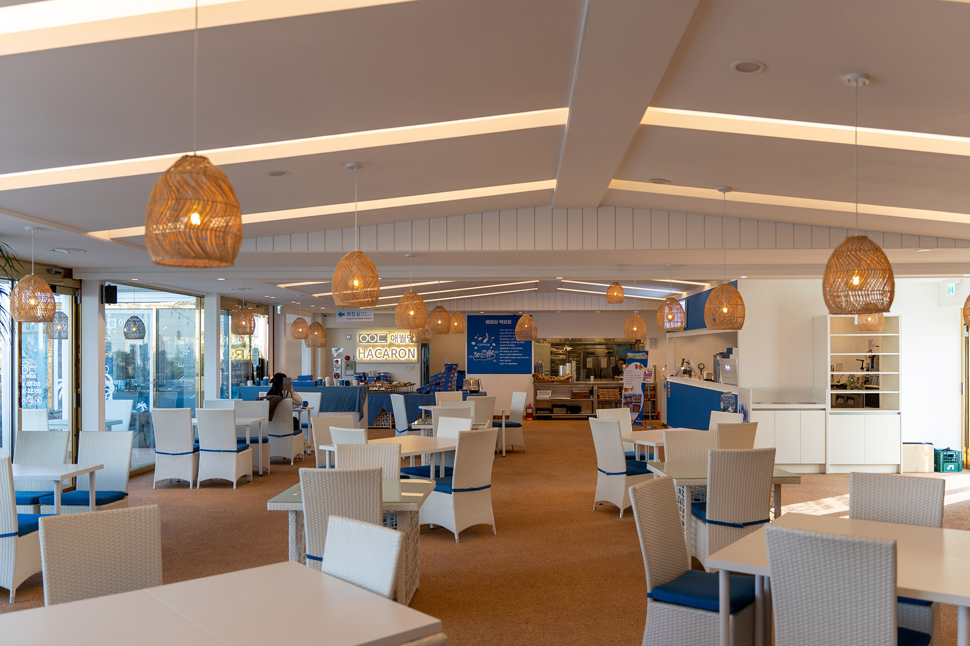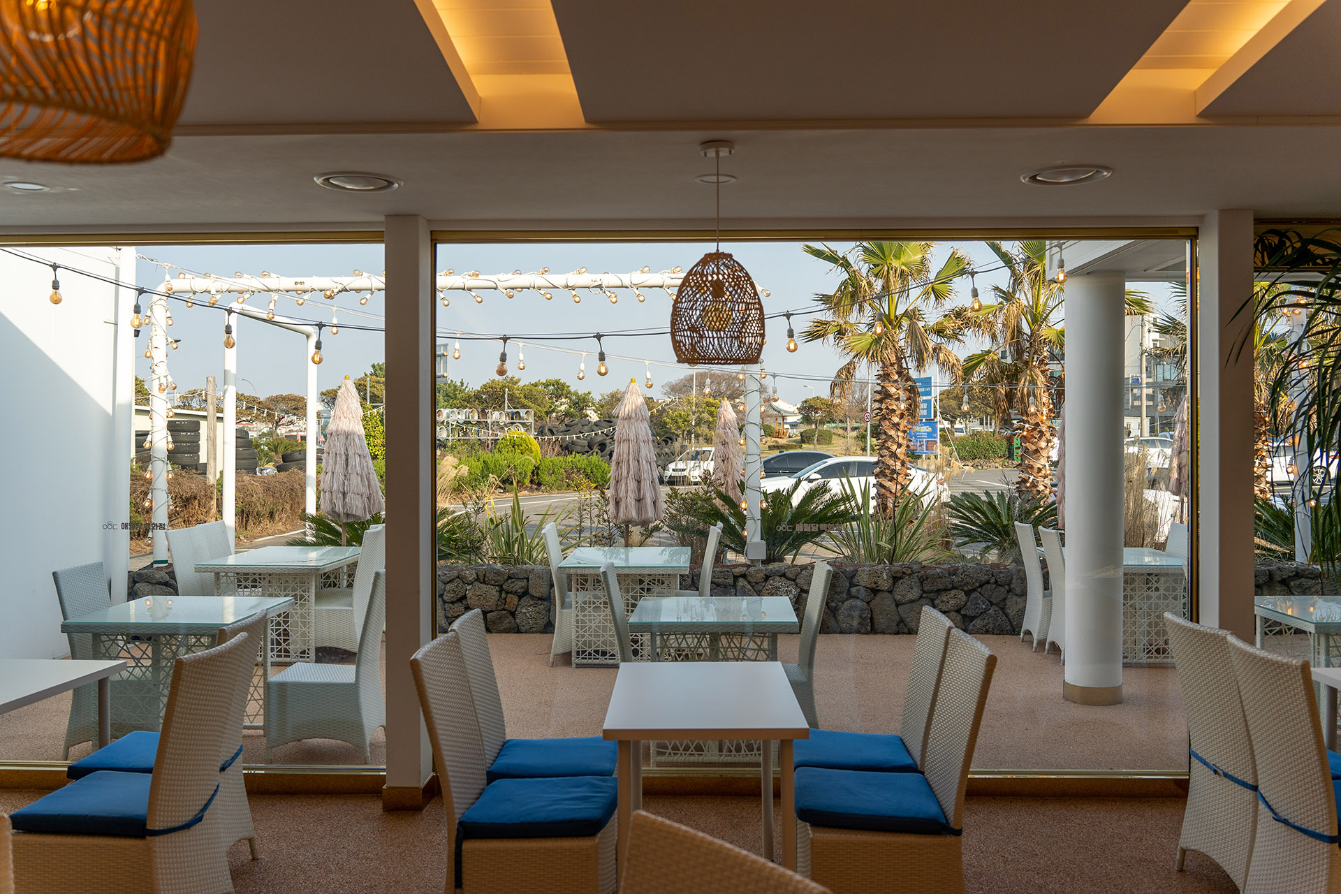 실내는 흰색을 메인으로 두고 파란색으로 포인트를 주어 청량감이 좋았습니다. 흰색과 파란색의 조화라니 산토리니 같기도 하네요. 라탄 등과 바닥 컬러, 창 밖으로 보이는 야자수도 어울립니다.