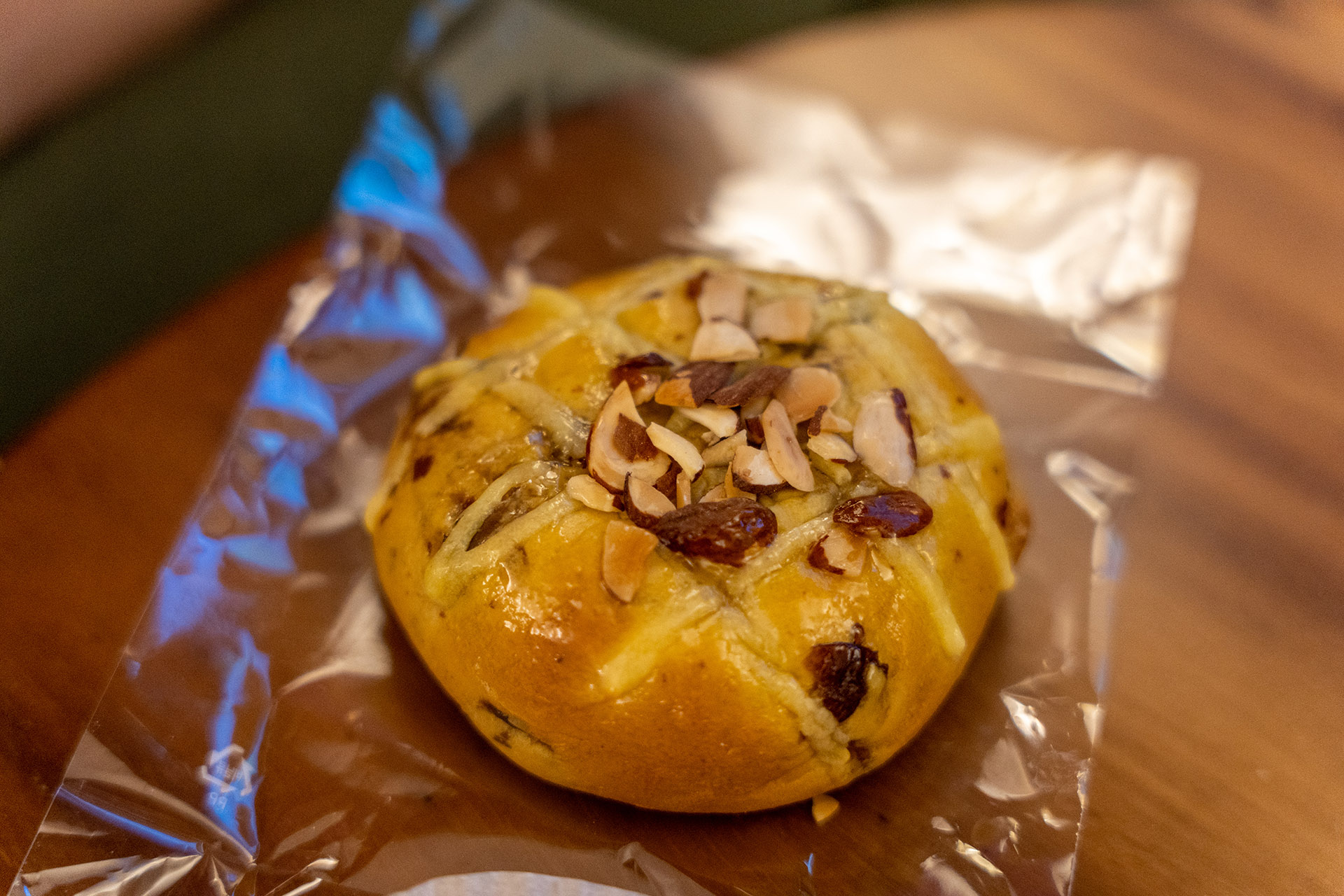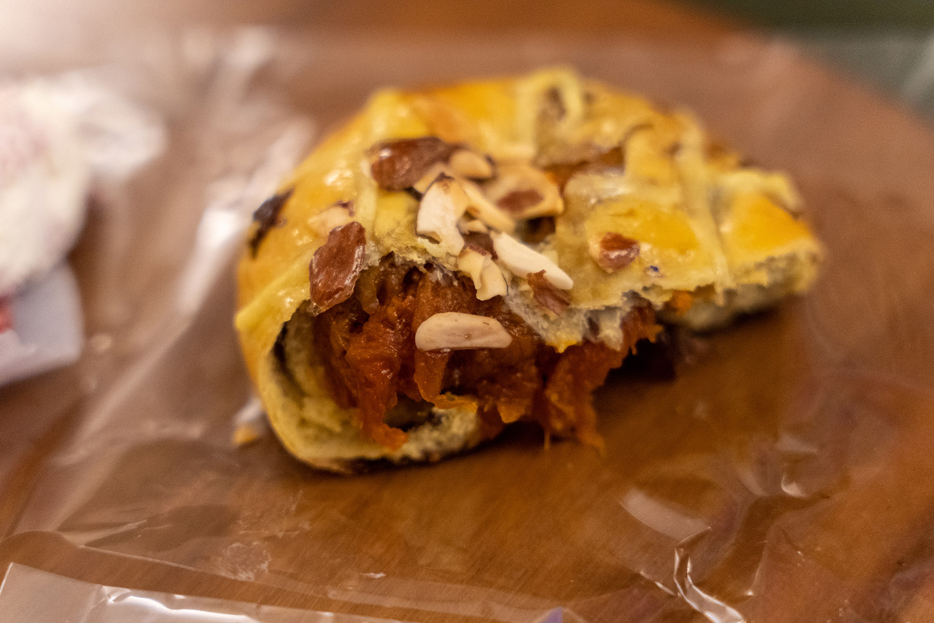 마지막으로 '한라산 깊은 골의 호박빵'인데요, 아무래도 대표메뉴를 먹어봐야 하지 않겠나 라는 생각에 골라봤습니다. 평소라면 먹지 않았을 메뉴지만요. 정말 특이한 빵이었는데요, 안에 들어있는 필링을 호박으로 만들었는데 호박죽 맛이 납니다. 빵과 호박죽이라니 참 묘한 조합이네요. 빵 피는 얇은 편이라 필링의 맛을 충분히 느낄 수 있었습니다.