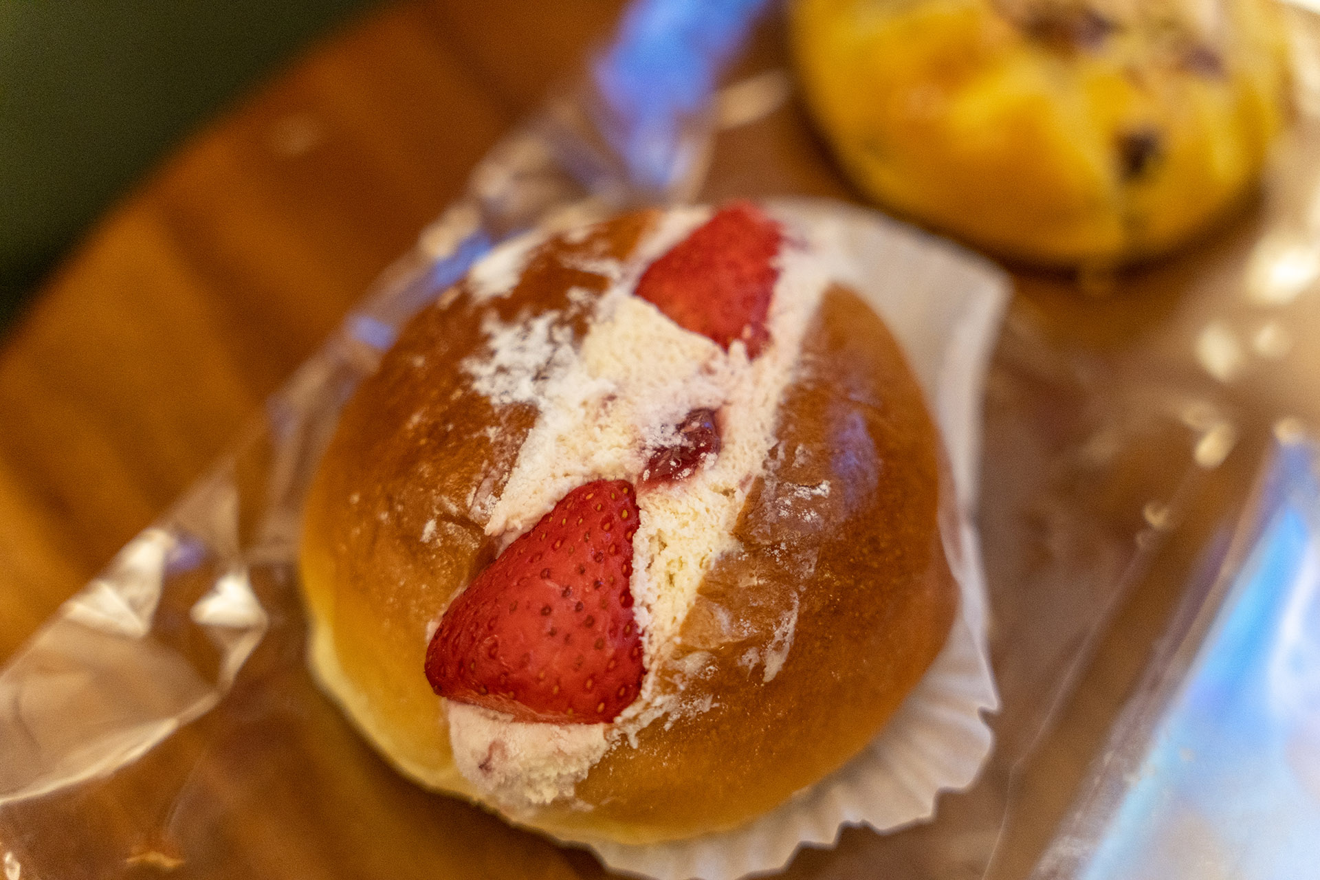크림 하영빵이 4종류 있었는데요, 하영은 제주도 방언으로 '많이'라는 뜻이라고 하네요. 크림을 많이 넣었다고 크림 하영빵이라고 합니다. 브리오슈 반죽에 크림을 채운 것이라 부드럽다고 합니다. 저희가 고른 것은 무난한 딸기 크림 하영빵.