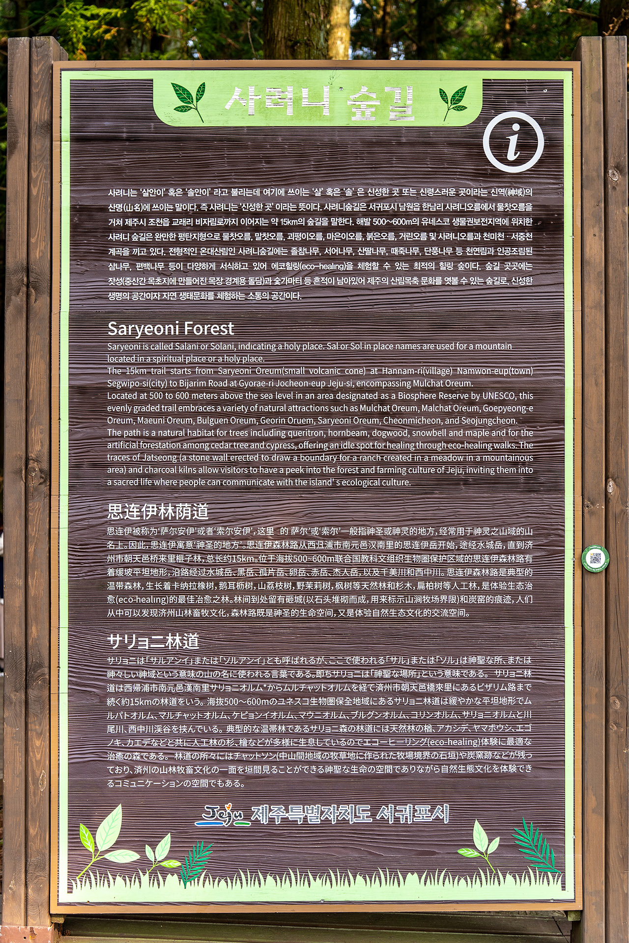 사려니 숲길에 대한 안내문입니다. 영어, 중국어, 일본어로도 적혀있네요. 외국인 관광객들도 많이 방문하는 걸까요? 어쨌든 저런 의미, 저런 장소라고 합니다. 여러 오름을 만날 수 있는 신성한 생명의 공간, 자연 생태문화를 체험하는 소통의공간.