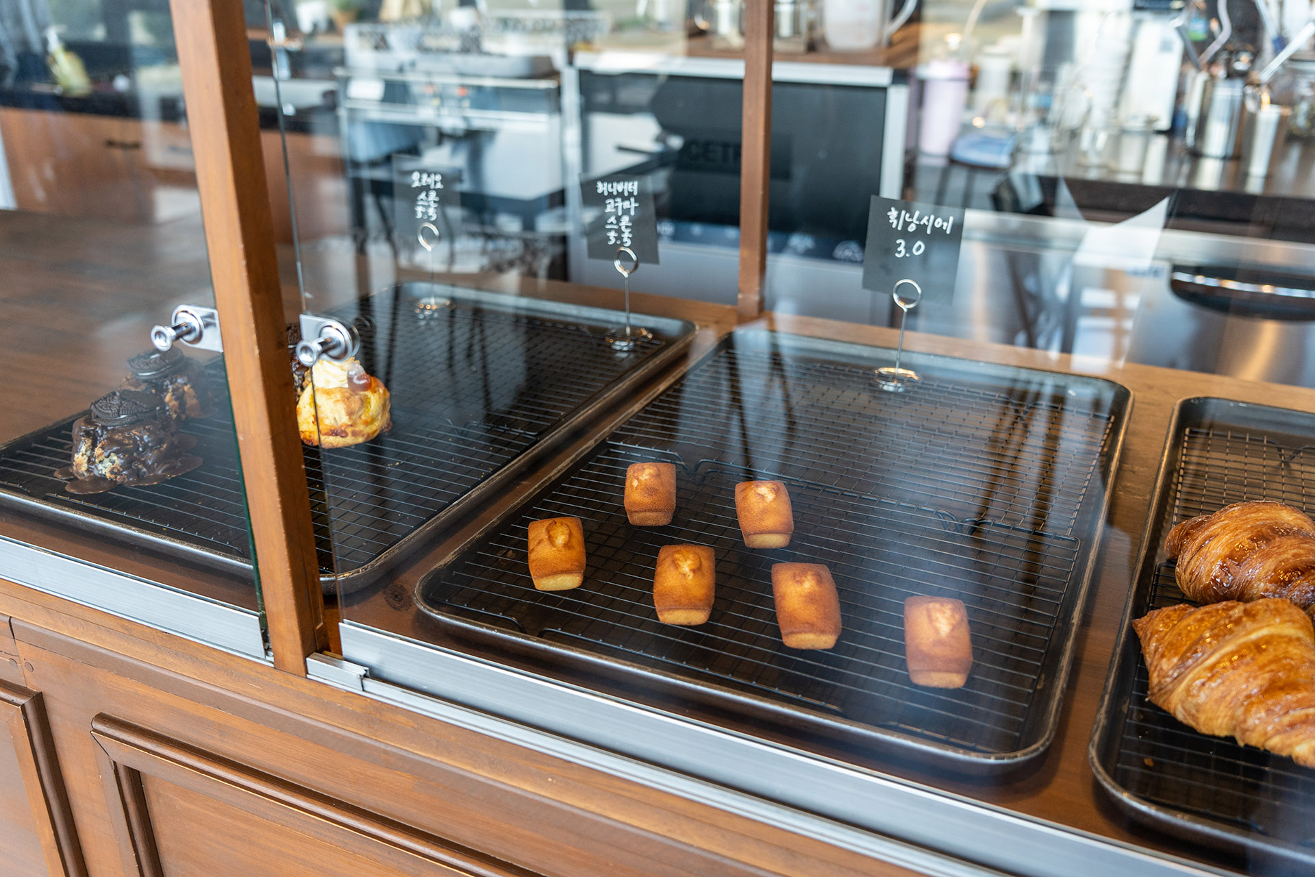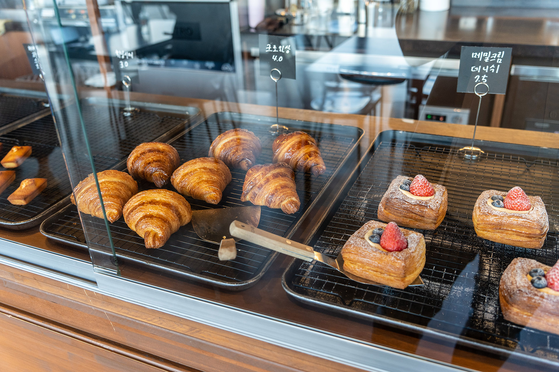 빵 종류는 크로와상(4,000원), 메밀크림 데니쉬(7,500원), 오레오 스콘(5,500원), 휘낭시에(3,000원), 허니버터 고구마 스콘(5,500원) 등이 있었습니다.