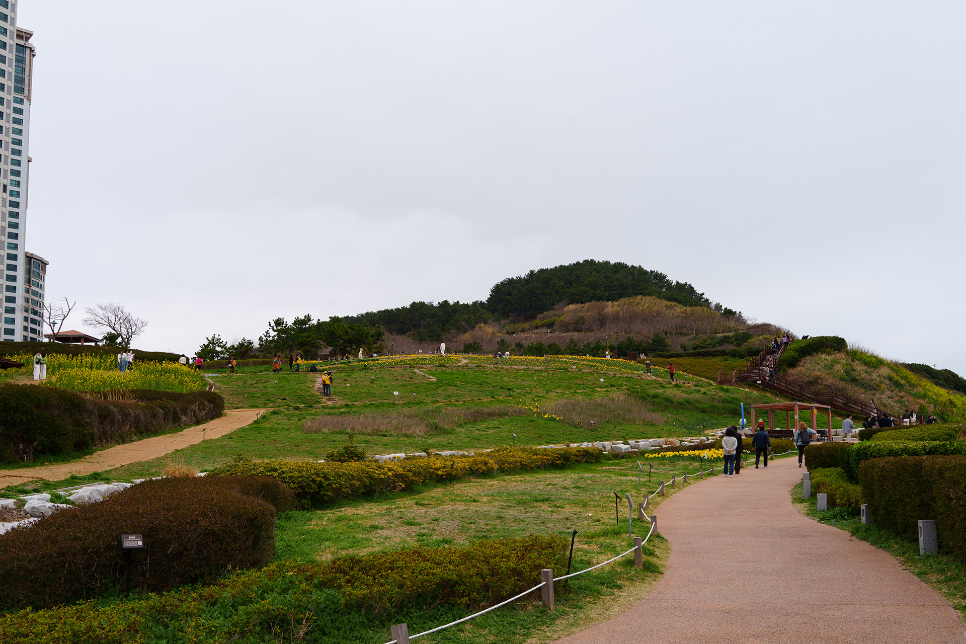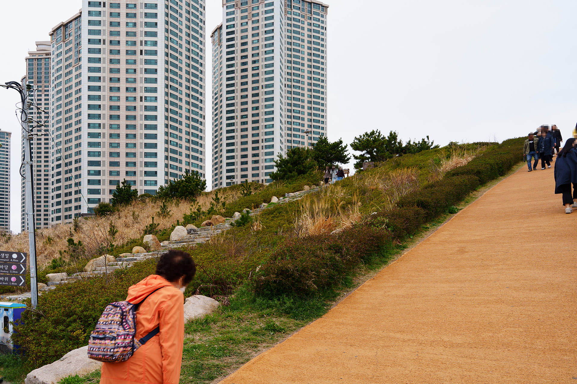 해맞이공원으로 가기 위해서는 오르막길을 올라야 합니다. 꽤나 가파르지만 짧은 구간이므로 크게 힘들지는 않습니다. 한쪽은 경사로, 한쪽은 돌계단으로 되어 있습니다만 돌계단 쪽은 계단의 간격이 애매하여 그리 편하지는 않습니다. 언덕을 오르다 보면 멀리 해운대와 달맞이고개가 보입니다.