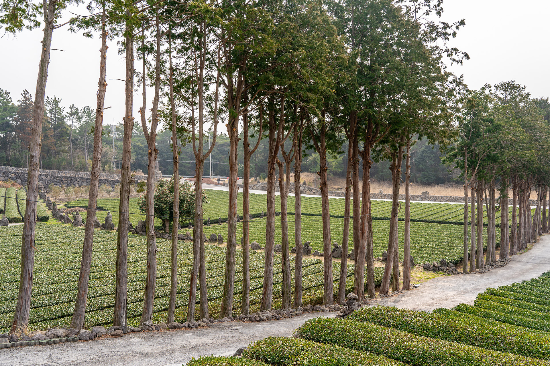 서귀다원을 검색하면 길을 따라 늘어선 키 큰 나무 사진이 꼭 나옵니다. 토스카나 지역의 빌라 입구를 연상시키는 모습입니다. 위 사진은 다실 근처 주차장에서 아래를 보며 찍은 사진입니다. 줄 맞춰 늘어선 나무처럼 가지런한 차밭도 아름답습니다.