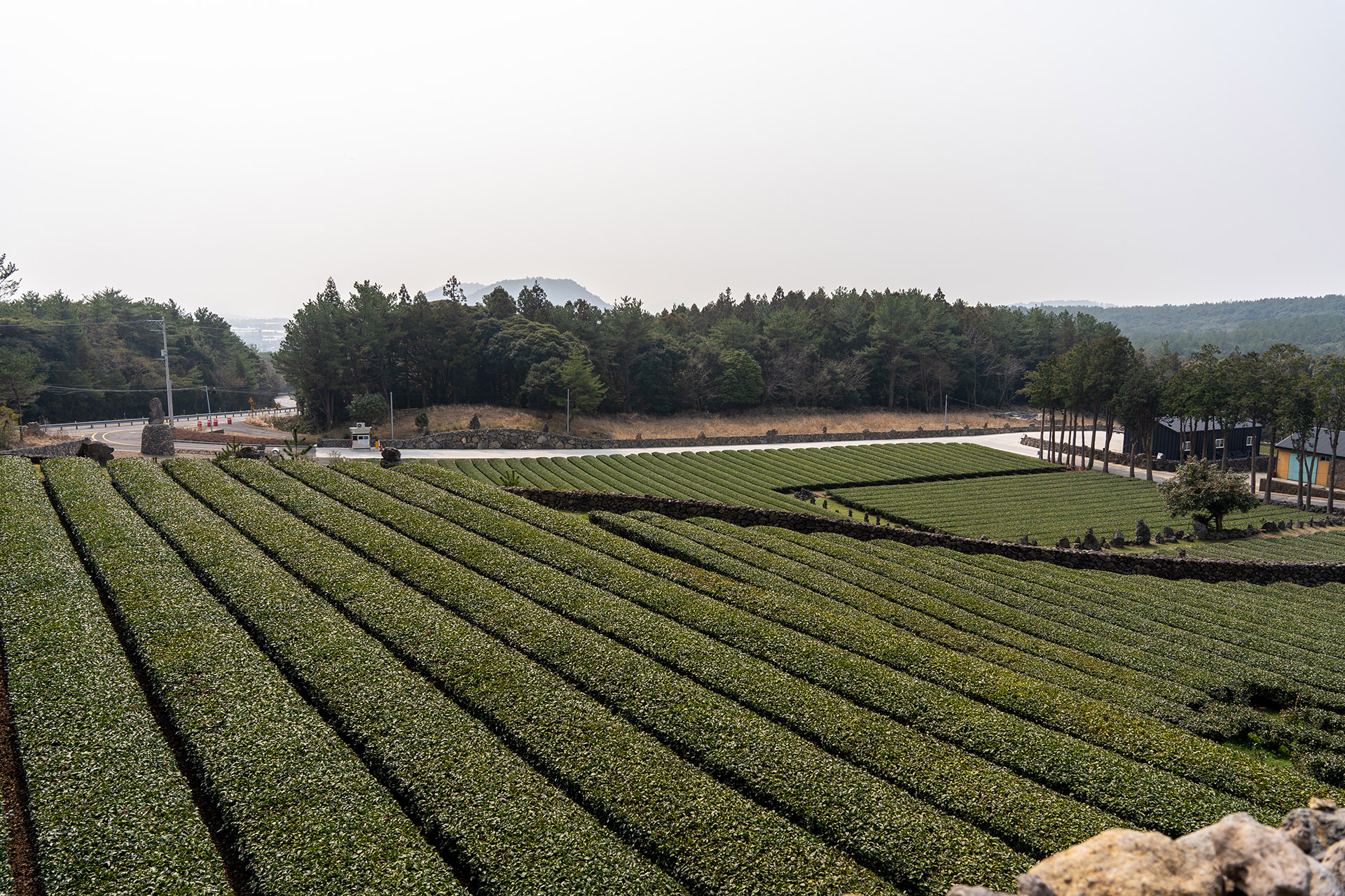 다실 뒤로 돌아가면 전망대로 갈 수 있습니다. 전망대라고 해도 어마어마하게 높거나 하진 않습니다만 서귀다원을 내려다보기엔 충분합니다. 멀리 한라산도 보이지만 이 날은 시계가 좋지 않아 잘 보이지는 않았습니다.