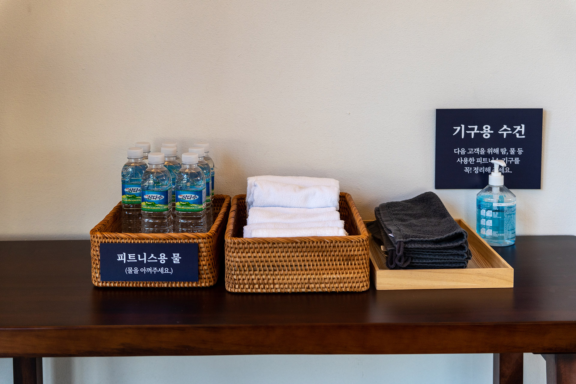피트니스에는 러닝머신 3대, 천국의 계단 1대, 스미스머신 1대 등 몇 개의 기구가 비치되어 있습니다. 러닝머신은 호수를 바라보며 뛸 수 있습니다. 스미스 머신 뒤로는 포레스트 가든이 있고요. 수건과 물은 준비되어 있으니 카드키만 챙겨서 운동복 차림으로 오시면 됩니다. 그런데 여기까지 와서 피트니스를 이용할 사람이 얼마나 있겠나 싶긴 합니다.