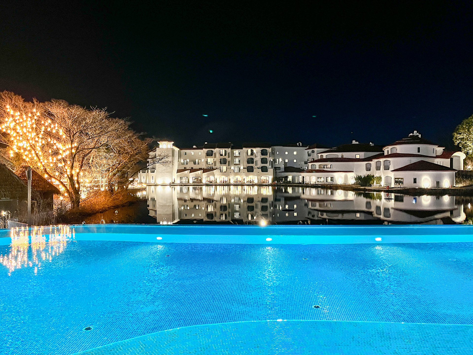 수영장 쪽에서 호텔을 바라보면 이런 느낌. 조명이 켜지니 느낌이 좀 다르죠? 예, 고스트도 남다르네요...