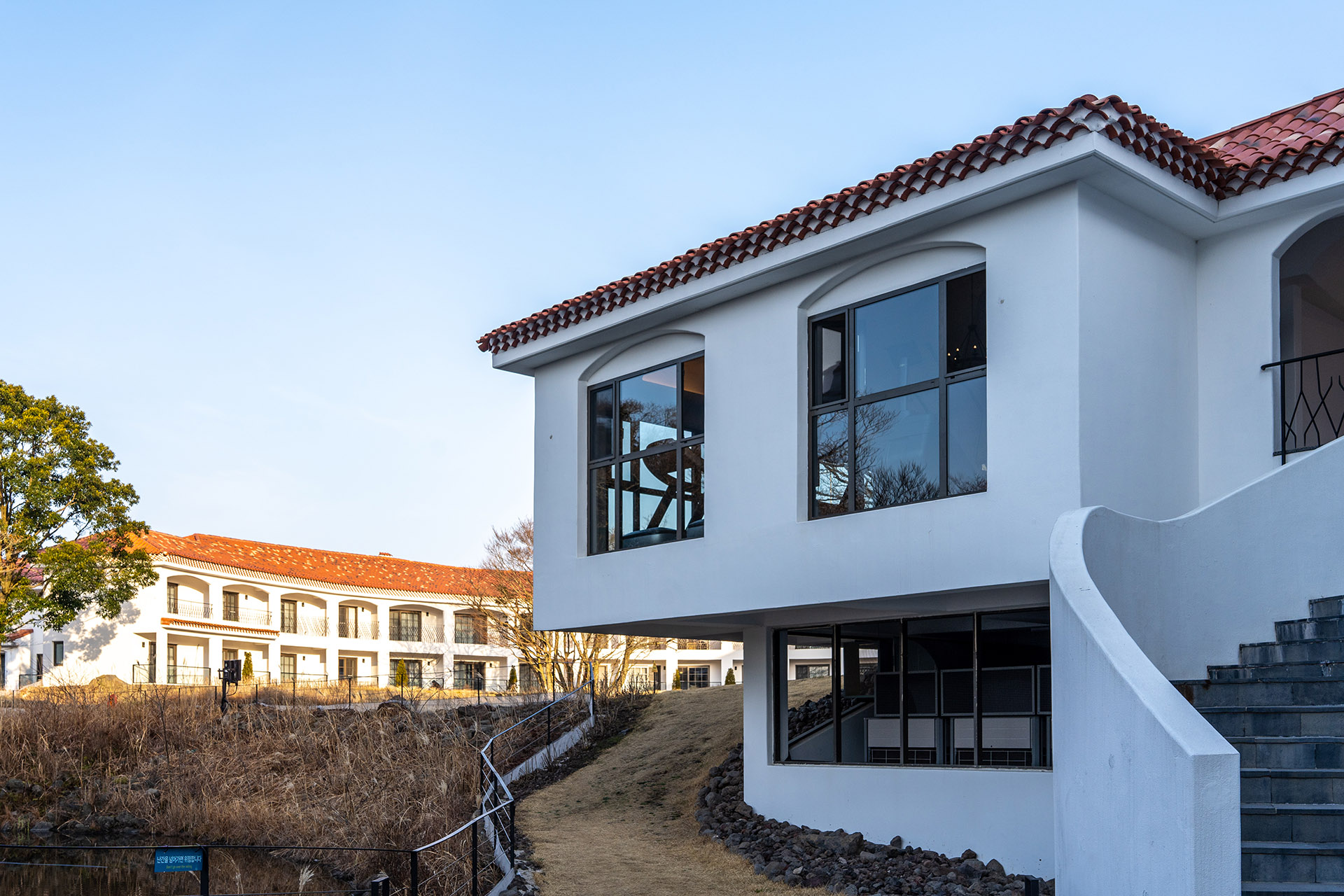 호텔 건물 바깥쪽으로 호숫가 사이에 짧은 길이 있습니다. 수영장으로 향하는 다리가 있고요, 이 다리 반대편은 건물 입구인데 키즈존/다이닝 룸 바로 앞입니다. 이른 시간이기 때문에 수영장에 입장은 안 돼서 입구까지만 가봤습니다.