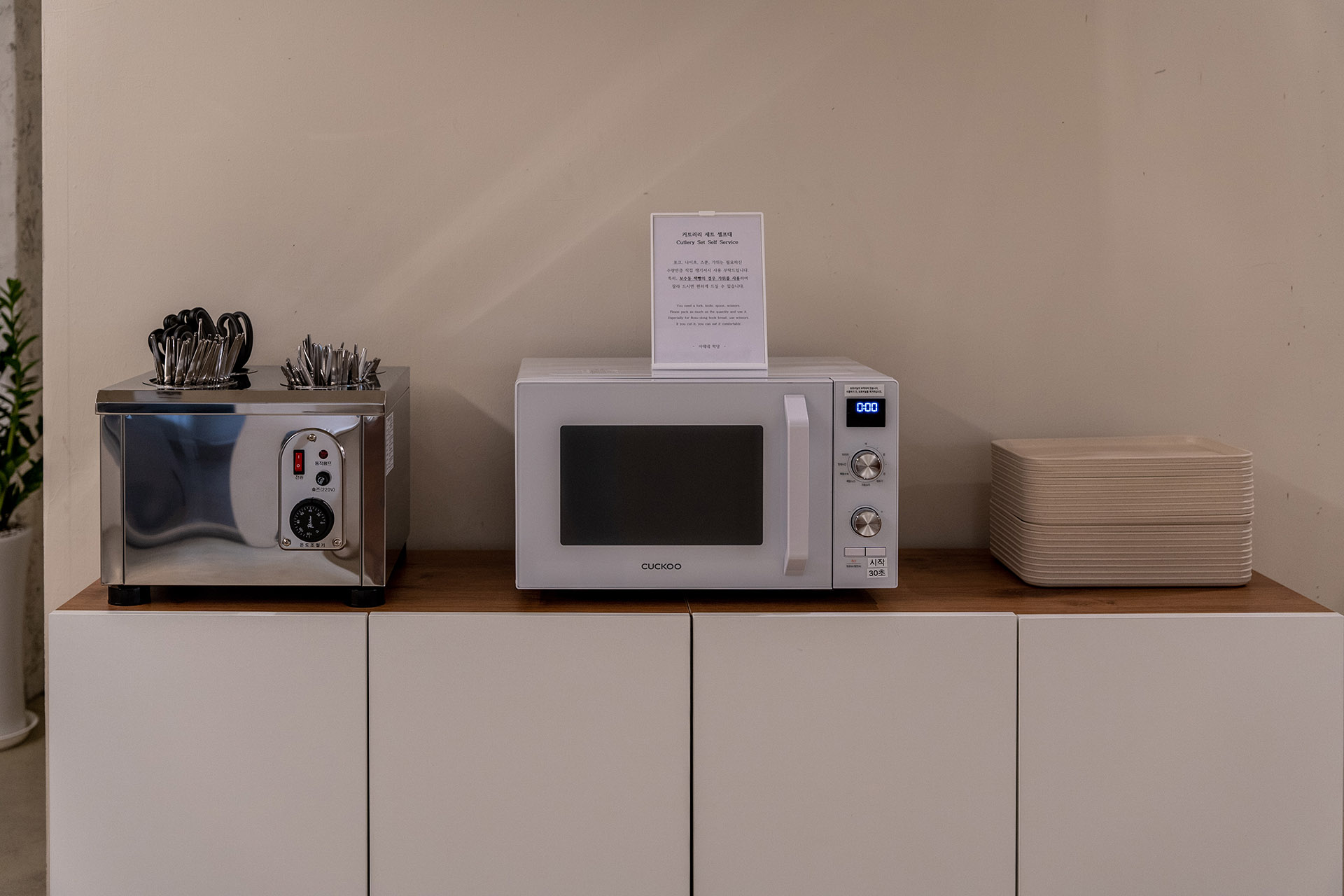 베이커리 쇼케이스 뒤쪽에 있는 트레이에 빵을 담에 커틀러리와 함께 가져가면 됩니다. 전자레인지가 있으니 원하는 만큼 데워서 드시면 되고요.