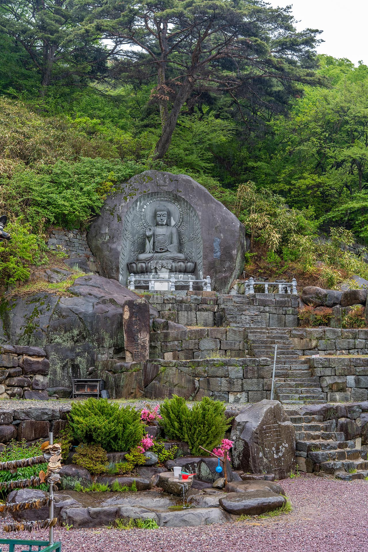 계단 옆으로 피어있는 철쭉들. 비가 오고 있어서 평소보다 채도가 높아 몇 배는 더 아름답습니다. 물방울이 맺힌 꽃잎은 이런 날이 아니면 볼 수 없죠. 맑은 날에 비해 다소 고생스럽지만 그 수고로움을 충분히 보상받는 느낌입니다.