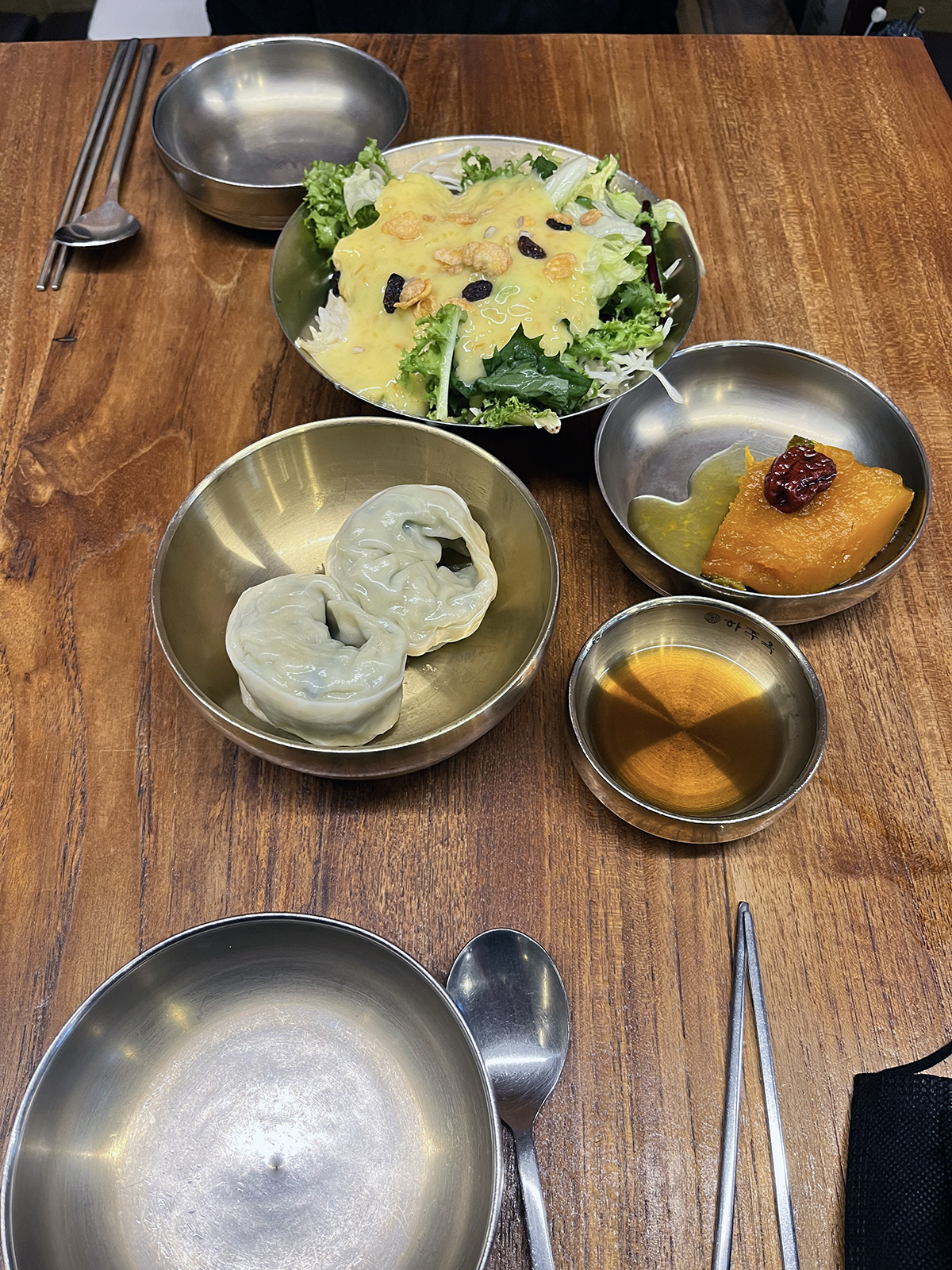 주문한 메인 메뉴가 나오기 전에 애피타이저를 먼저 가져다줍니다. 음식이 준비되는 동안 기다리면서 허기를 달래라고 나오는 것이겠죠. 이날은 유자소스 샐러드, 단호박찜, 찐만두였습니다. 다른 날에 왔던 지인에게 물어보니 다른 메뉴가 제공되었다고 합니다. 아마 그날그날 상황에 맞게 나오나 봅니다.
