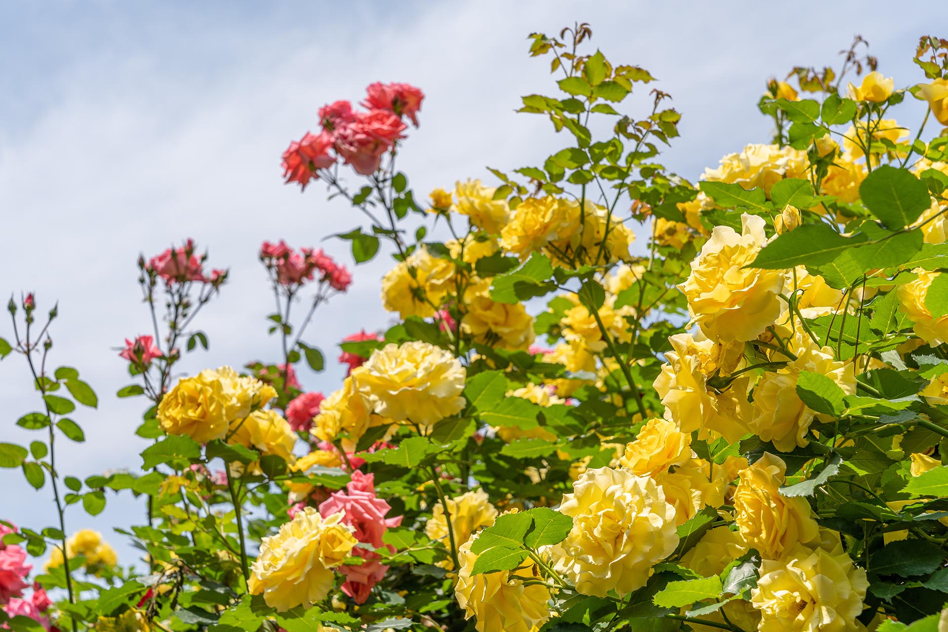 대략 50종의 장미를 심어놨다고 하는데요, 이름표도 곳곳에 붙어있습니다. 어디서 본 듯한 이름도 보이고 전혀 생소한 이름도 보입니다. 모습도 색깔도 정말 각양각색인데요, 무슨 장미가 손바닥 두 개를 붙인 정도의 크기인 것도 있고 꽃집에서 익숙하게 보던 친구들도 있고요. 빨강, 핑크, 노랑, 주황 등 알록달록 정말 장관입니다. 이렇게나 많은 장미를 한곳에서 볼 수 있다는 것에 놀라게 될 겁니다.