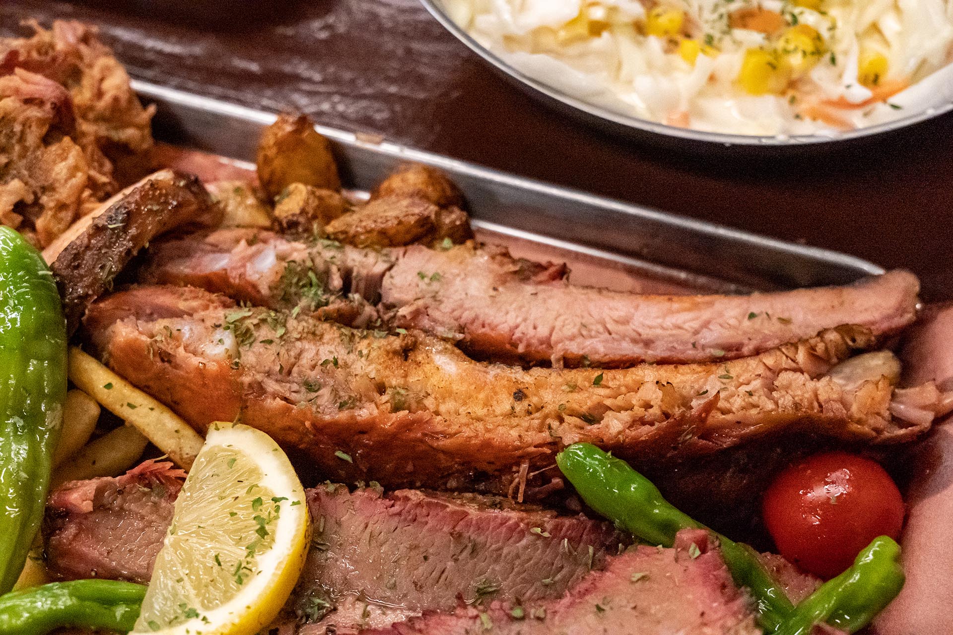 고기는 풀드포크, 통베이컨, 스페어립, 브리스킷이 나오고 감자튀김, 꽈리고추, 양파, 미니번, 타코, 코울슬로와 소스가 함께 제공됩니다.