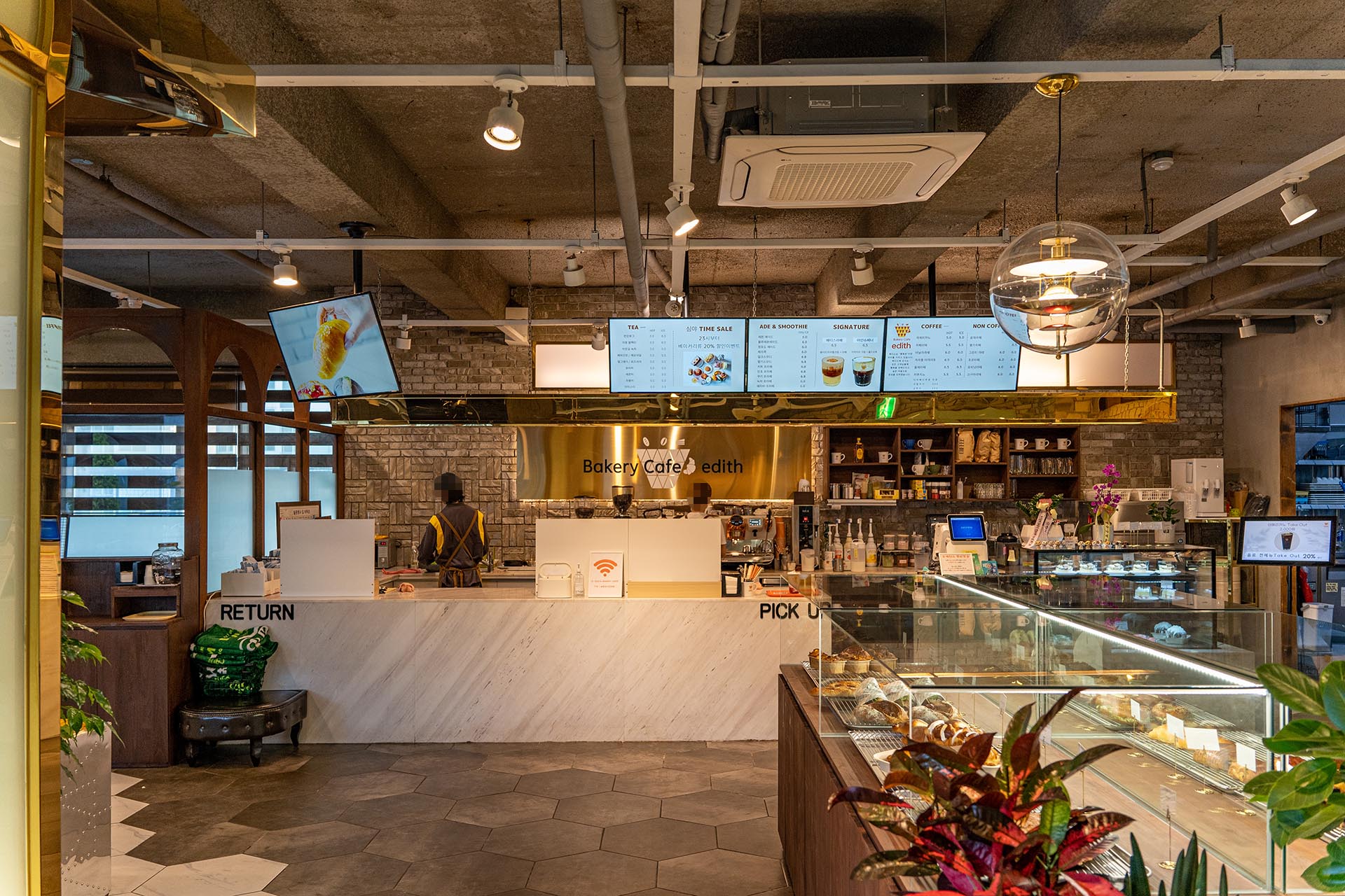 내부로 들어가면 가장 먼저 보이는 것은 베이커리 진열대와 바입니다.